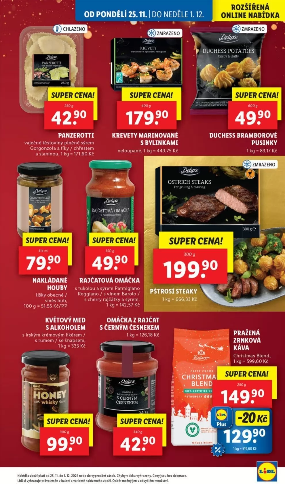 Od pondělí 25. listopadu do neděle 1. prosince můžete v obchodech Lidl využít skvělou nabídku chlazených a zmrazených produktů. Mezi nimi najdete panzerotti, vaječné těstoviny plněné sýrem gorgonzola a fíky, za super cenu 179 Kč za 250 g. Dále jsou k dispozici marinované krevety s bylinkami, které stojí 449,75 Kč za 1 kg.