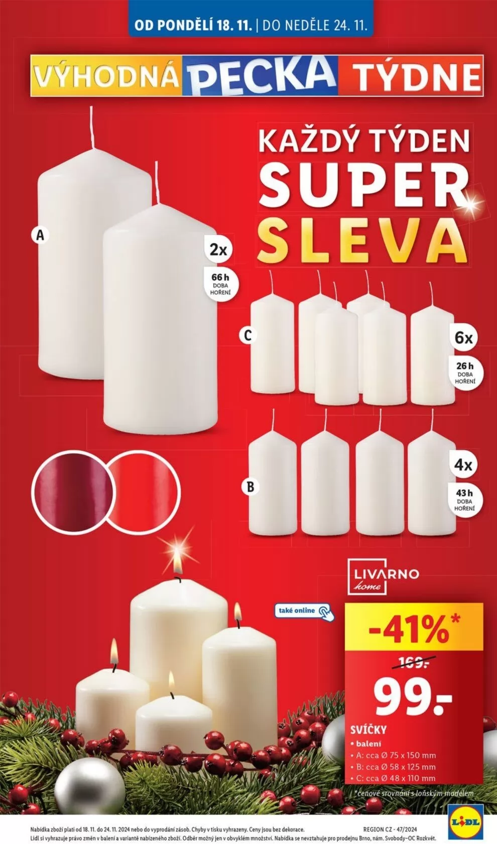 Od pondělí 18. listopadu do neděle 24. listopadu přichází Lidl s výhodnou nabídkou! V rámci týdne plného slev si můžete vybrat z širokého sortimentu produktů, včetně dekorativních svíček v různých baleních. Svíčky jsou k dispozici v rozměrech cca 75 x 150 mm a cca 58 x 125 mm. Nabídka platí do vyprodání zásob, takže neváhejte a využijte této skvělé příležitosti. Ceny a dostupnost se mohou lišit, a proto doporučujeme navštívit obchod co nejdříve. Těšíme se na vaši návštěvu!