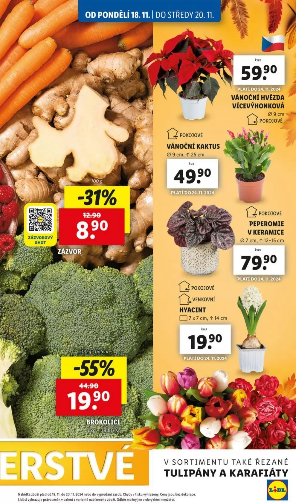 Od pondělí 18.11. do středy 20.11. si můžete v Lidlu pořídit širokou nabídku pokojových a venkovních rostlin. Mezi nimi najdete vánoční kaktus za 49 Kč, vánoční hvězdu vícevýhonkovou v 9 cm za 79 Kč a peperomie v keramice o velikosti 7 cm. Nezapomeňte také na hyacinty v květináči 7x7 cm, které jsou ideální pro vánoční výzdobu. V sortimentu jsou také řezané tulipány a karafiáty. Akce platí do 24.11.2024 nebo do vyprodání zásob. Ceny jsou uvedeny bez dekorace.