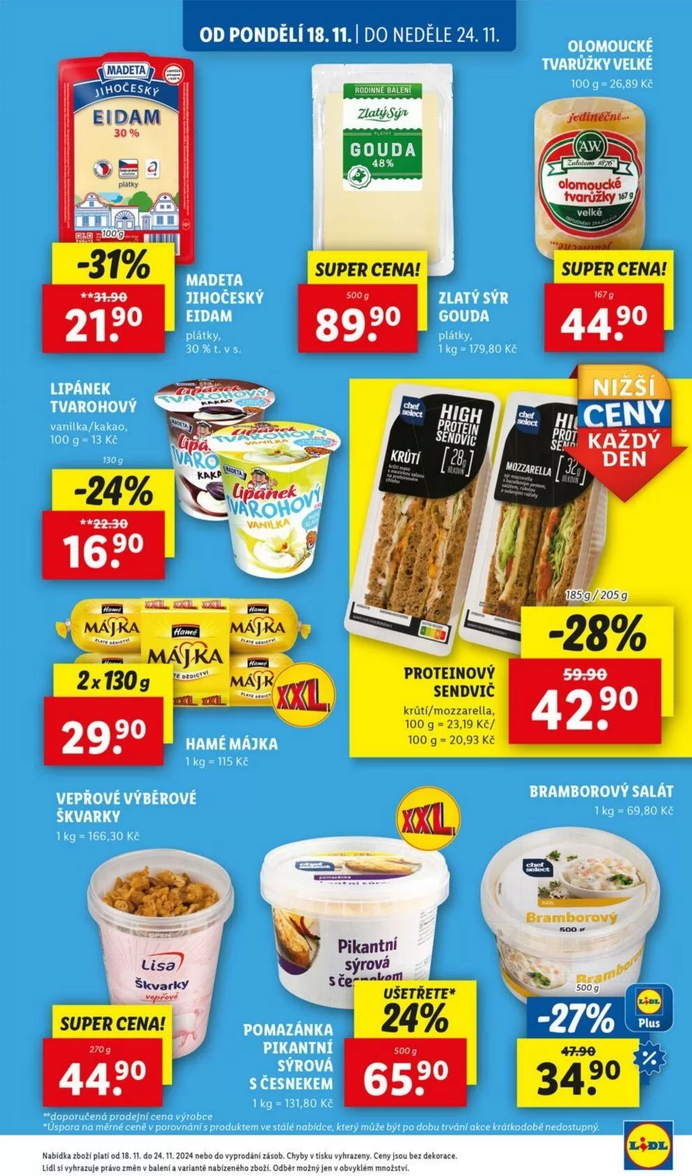 V letáku obchodu Lidl najdete širokou nabídku kvalitních produktů za skvělé ceny. Mezi nimi se objevují oblíbené sýry, jako je Madeta Eidam s 30% t.v.s. a Gouda, která je nyní za super cenu. Nezapomeňte také na tvarohové výrobky Lipánek v příchutích vanilka a kakao, které jsou cenově výhodné.