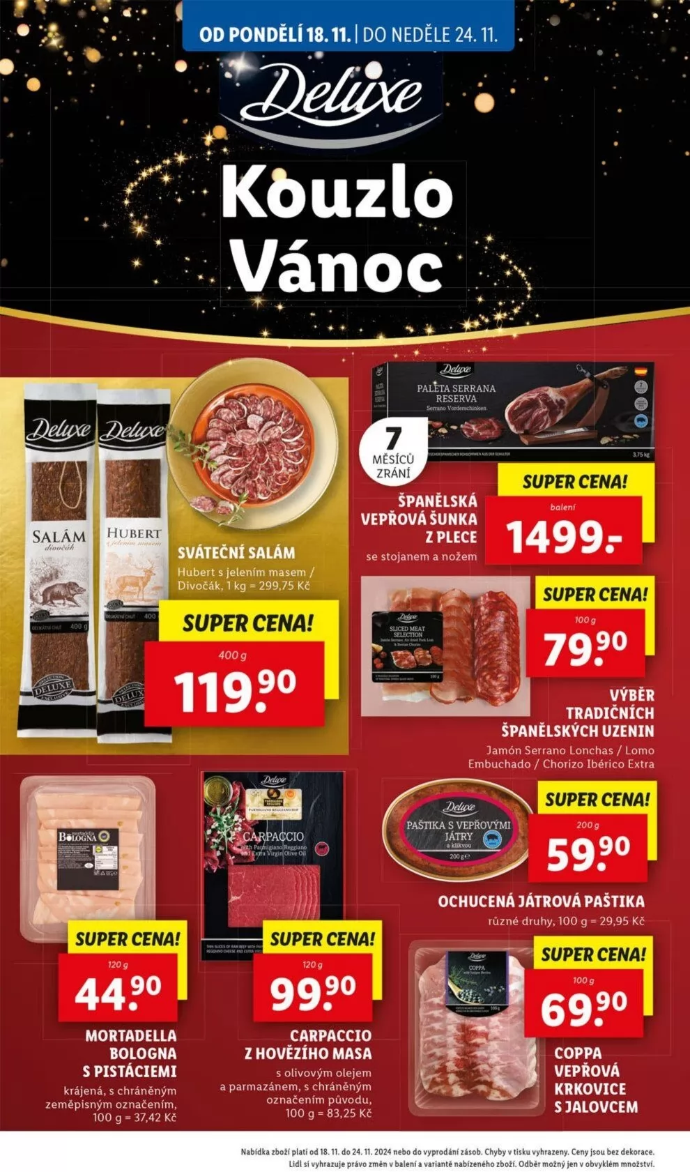 Od pondělí 18.11. do neděle 24.11. se v obchodě Lidl koná akce "Kouzlo Vánoc". V nabídce najdete široký výběr tradičních španělských uzenin, jako je jamón serrano, lomo embuchado a chorizo ibérico extra. Nezapomeňte také na sváteční salám Hubert s jelením masem a divočákem, který je k dostání za skvělou cenu 299,75 Kč za 1 kg.