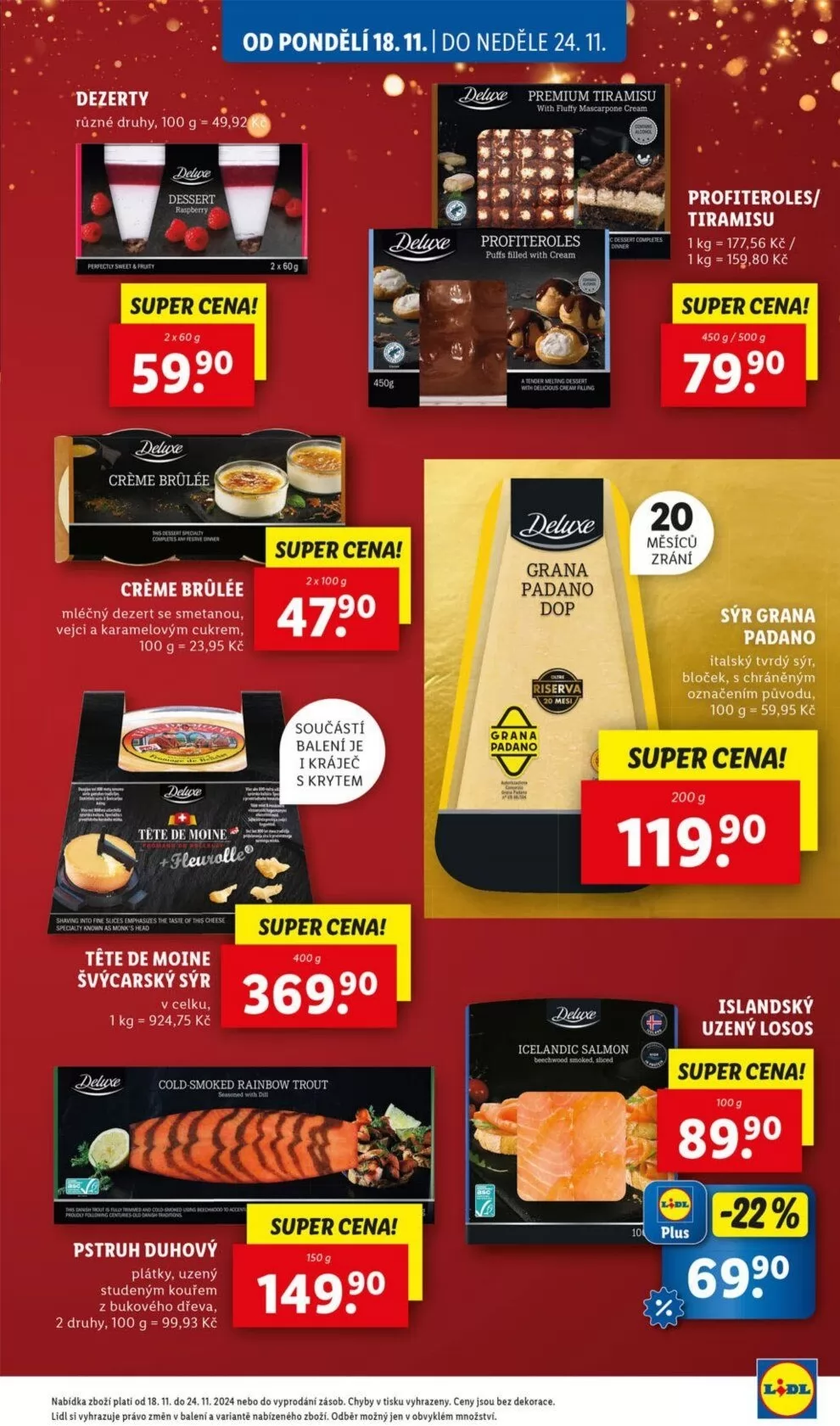 V letáku obchodu Lidl najdete širokou nabídku dezertů, které potěší každého milovníka sladkostí. Od pondělí 18.11. do neděle 24.11. si můžete zakoupit různé druhy dezertů, jako je premium tiramisu nebo krém brülée, za super ceny. Například 100 g mléčného dezertu se smetanou, vejci a karamelovým cukrem je k dostání za 23,95 Kč.
