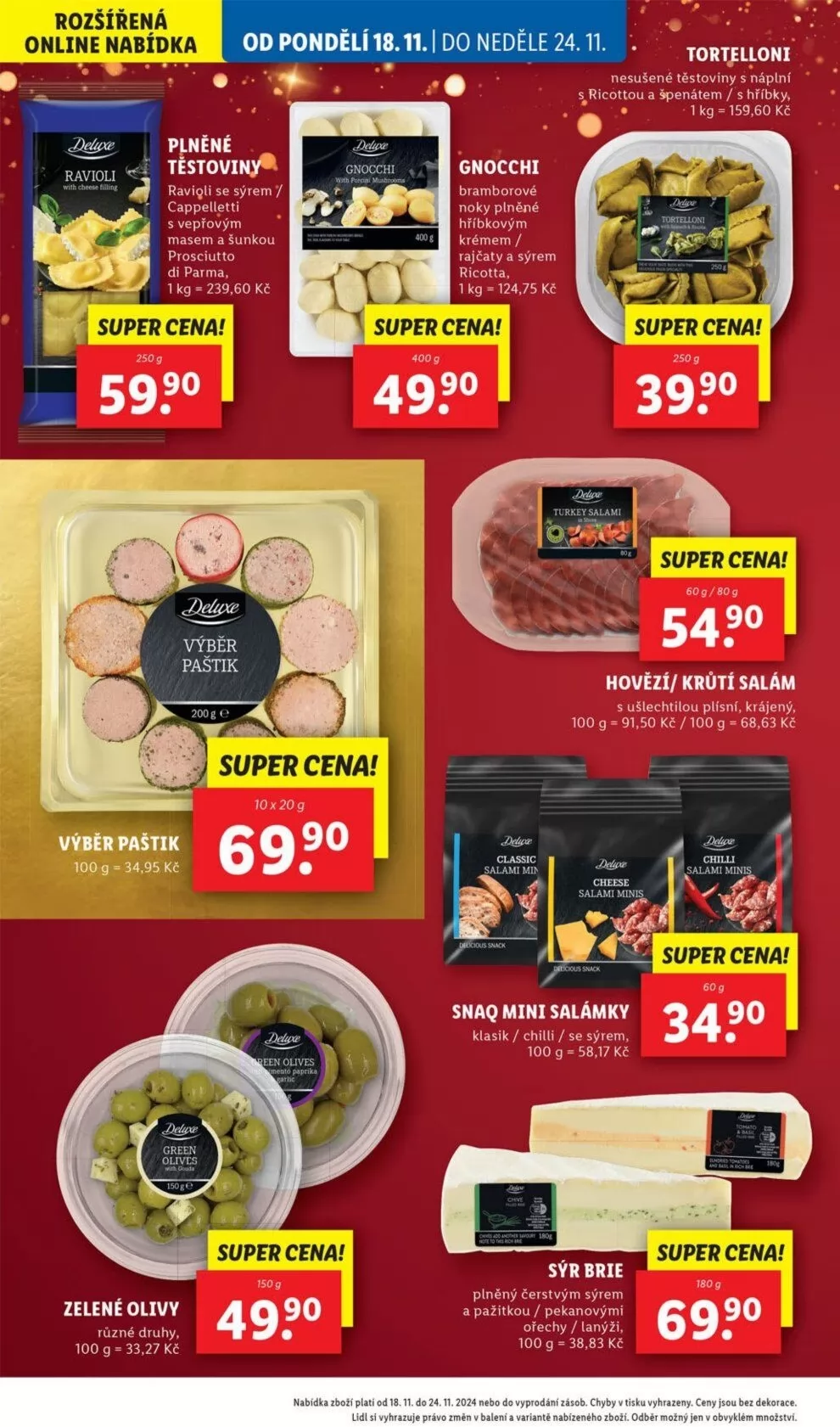 Od 18.11. do 24.11. máte možnost zakoupit skvělé produkty v letáku obchodu Lidl. Nabídka zahrnuje plněné těstoviny jako tortelloni a ravioli, které jsou ideální pro rychlou a chutnou večeři. Gnocchi s hříbkovým krémem nebo rajčaty a sýrem ricotta potěší každého milovníka těstovin.