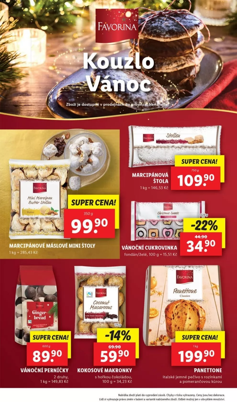 V letáku obchodu Lidl najdete skvělou nabídku vánočních cukrovinek a specialit. Mezi nimi se objevují marcipánové máslové mini stoly za super cenu 99 Kč za 350 g. Dále si můžete dopřát vánoční perníčky ve dvou druzích za 89 Kč za 600 g. Pro milovníky sladkostí jsou k dispozici kokosové makronky s hořkou čokoládou za 59 Kč za 100 g. Nezapomeňte také na italské jemné pečivo panettone s rozinkami a pomerančovou kúrou za 199 Kč. Nabídka platí do vyprodání zásob, tak neváhejte!
