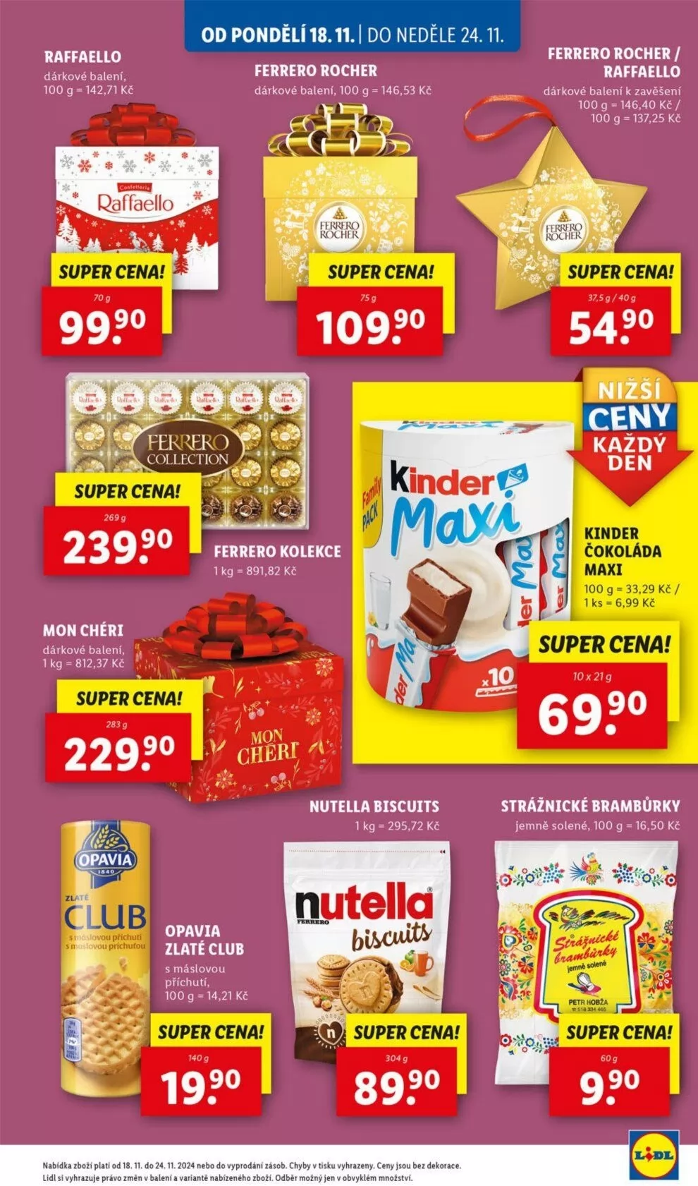 V letáku obchodu Lidl najdete širokou nabídku lahodných produktů za super ceny! Mezi nimi se objevují dárková balení Raffaello a Ferrero Rocher, které jsou ideální pro sváteční příležitosti. Raffaello 100 g za 142,71 Kč a Ferrero Rocher 100 g za 146,53 Kč potěší každého milovníka sladkostí.