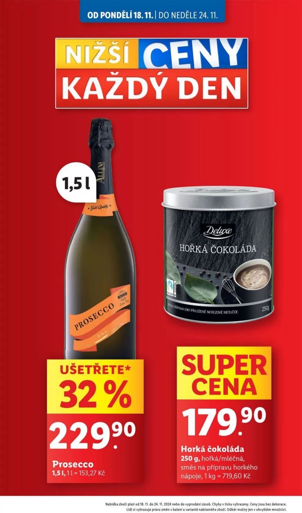 Od pondělí 18.11. do neděle 24.11. si nenechte ujít skvělé nabídky v obchodě Lidl! Každý den můžete zakoupit hořkou čokoládu s přiloženou nerezovou metličkou za skvělou cenu 229 Kč. Dále nabízíme prosecco 1,5 l za 179,90 Kč, což je výhodná cena 153,27 Kč za litr. Nezapomeňte také na horkou čokoládu, která je k dispozici v hořké nebo mléčné variantě, a to za 250 g, což vychází na 719,60 Kč za kilogram. Tato nabídka platí do vyprodání zásob, tak neváhejte a přijďte si pro své oblíbené produkty!