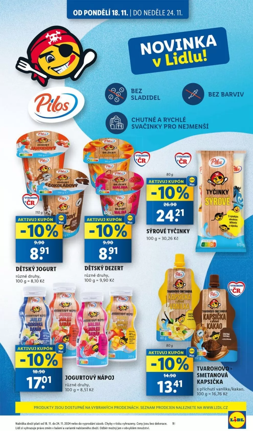 Od pondělí 18.11. do neděle 24.11. přichází Lidl s novinkami pro nejmenší! Nabízíme chutné a rychlé svačinky bez barviv a sladidel. V nabídce najdete dětský jogurt v různých druzích za 8,10 Kč (100 g) a dětský dezert také v různých variantách za 9,90 Kč (100 g). Nezapomeňte na sýrové tyčinky za 30,26 Kč (100 g) a jogurtový nápoj za 8,51 Kč (100 g). Dále nabízíme tvarohovou smetanovou kapsičku s příchutí vanilka/kakao za 16,76 Kč (100 g). Produkty jsou dostupné na vybraných prodejnách. Více informací najdete na www.lidl.cz. Těšíme se na vaši návštěvu!