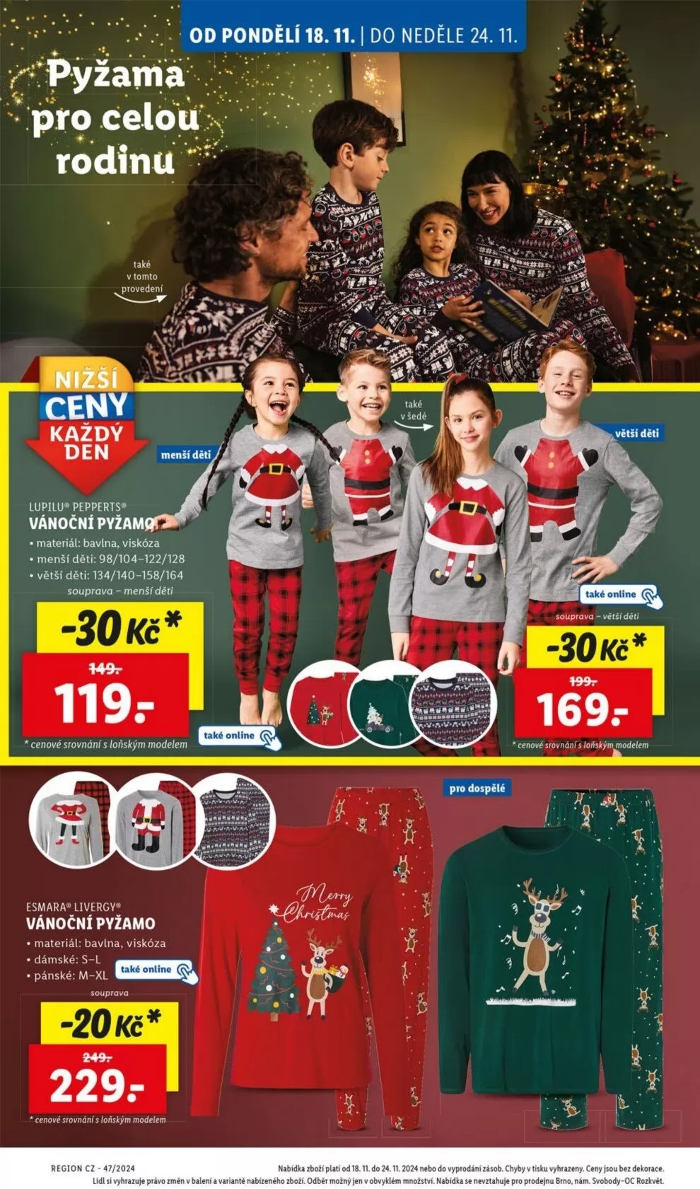 Od pondělí 18.11. do neděle 24.11. v obchodu Lidl najdete širokou nabídku vánočních pyžam pro celou rodinu. Pyžama jsou vyrobená z kvalitní bavlny a viskózy a jsou k dispozici pro menší děti ve velikostech 98/104-122/128 a pro větší děti 134/140-158/164. Soupravy pro menší děti jsou nyní za cenu 119 Kč, s cenovým srovnáním s loňským modelem.