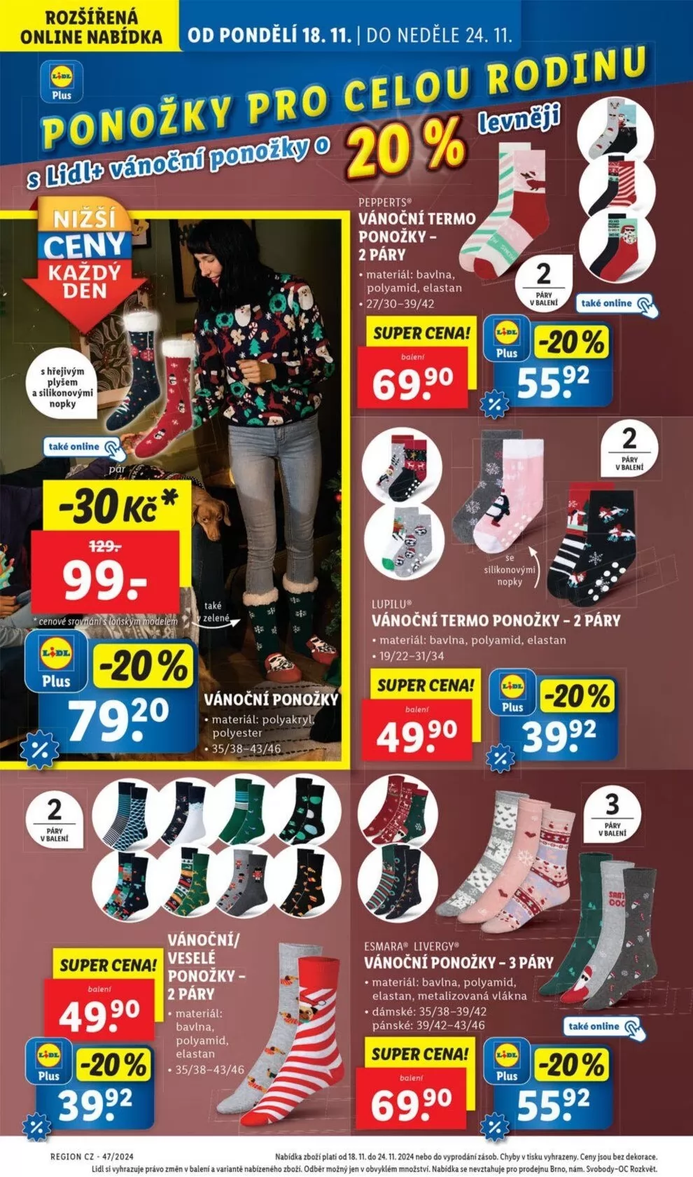 Od pondělí 18.11. do neděle 24.11. v obchodě Lidl najdete skvělou nabídku vánočních ponožek pro celou rodinu. V akci jsou vánoční termo ponožky v balení po dvou párech, vyrobené z příjemného materiálu, který zahrnuje bavlnu, polyamid a elastan. K dispozici jsou různé velikosti, takže si vybere každý.