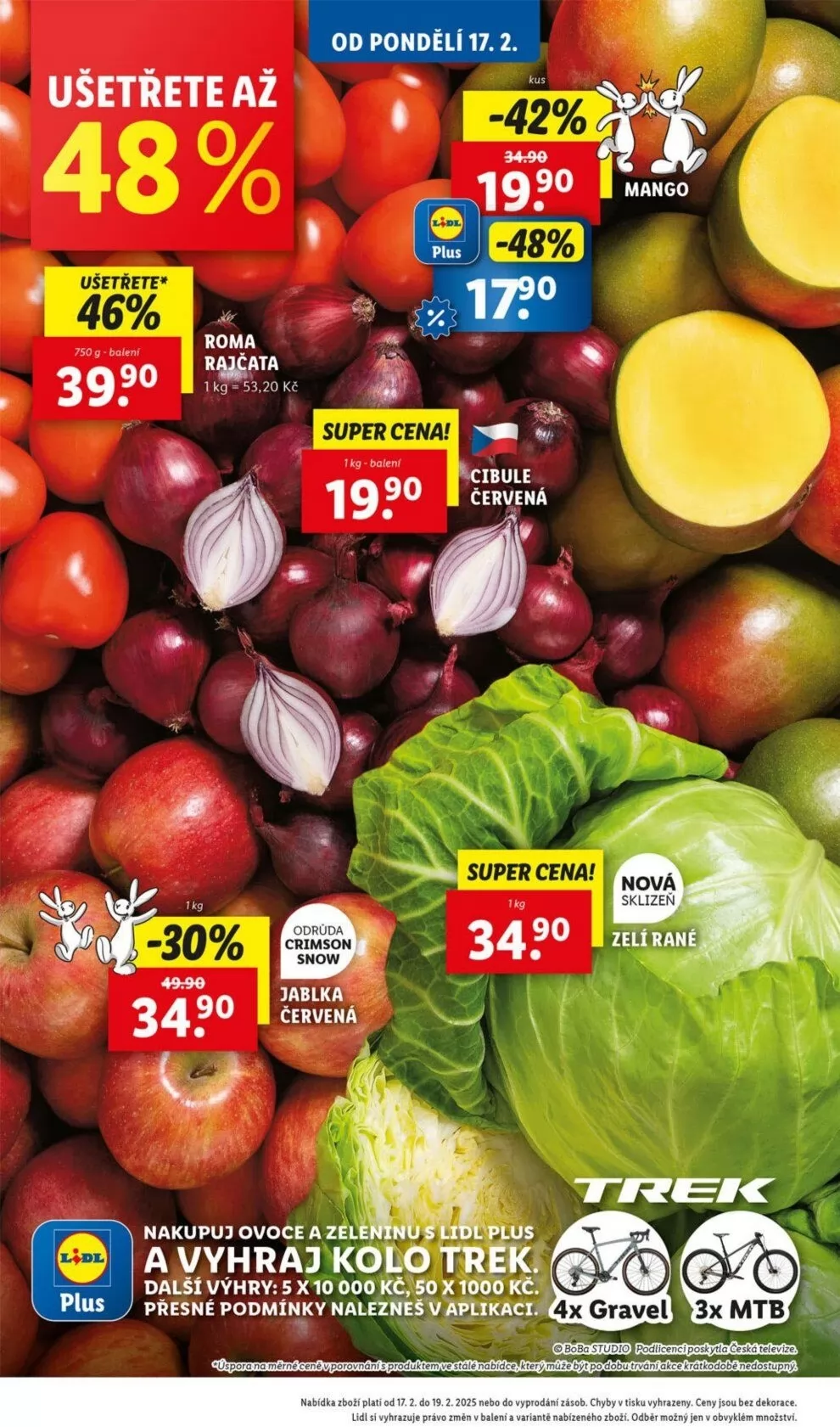 Ušetřete až 48% na vybraných produktech v letáku obchodu Lidl! Od pondělí 17.2. si můžete pořídit červená jablka odrůdy Crimson Snow za super cenu 19 Kč za 750 g balení. Také červená cibule a rané zelí jsou nyní k dostání za výhodné ceny. Navíc, nakupujte ovoce a vyhrajte kolo Trek a další skvělé ceny! Nabídka platí do 19.2.2025 nebo do vyprodání zásob. Nezapomeňte, že ceny jsou bez dekorací a Lidl si vyhrazuje právo na změny v balení a variantách zboží.