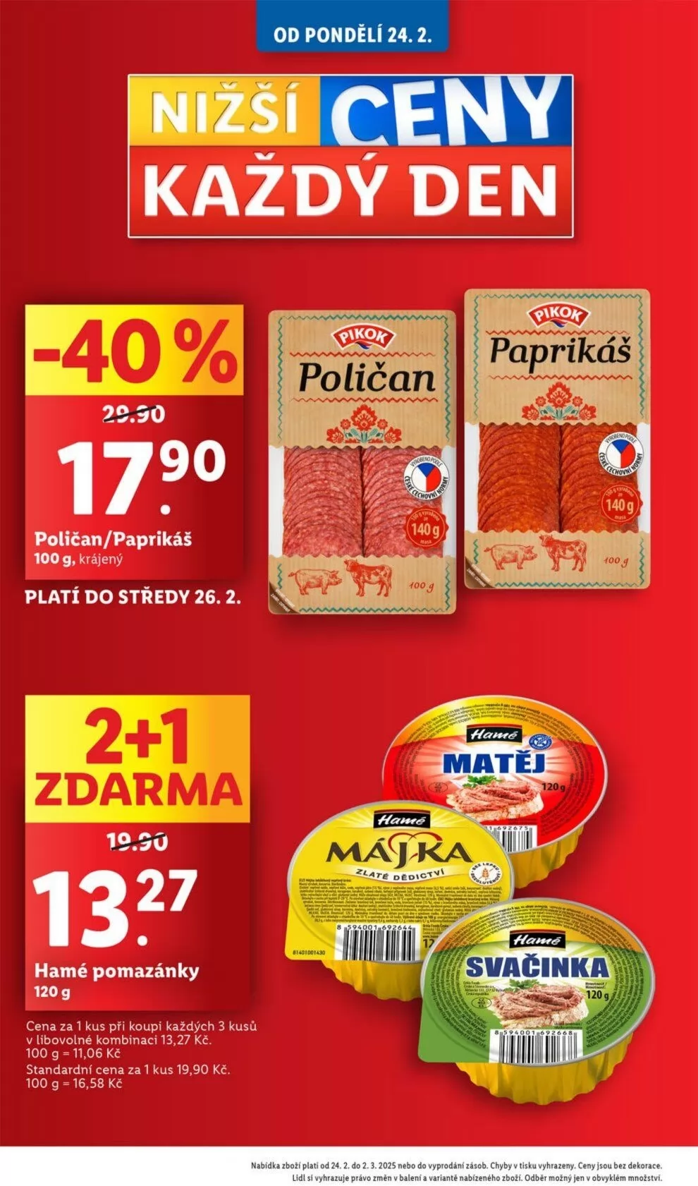 Od pondělí 24. února si můžete v obchodě Lidl vychutnat skvělé nabídky! Každý den na vás čeká lahodný paprikáš, který je k dostání v krájené variantě. Platí do středy 26. února. Navíc při koupi tří kusů Hamé pomazánek o hmotnosti 120 g získáte jeden zdarma! Cena za jeden kus při koupi tří je 13,27 Kč, což je skvělá příležitost, jak ušetřit. Standardní cena za jeden kus je 19,90 Kč. Nezapomeňte, že nabídka platí do 2. března 2025 nebo do vyprodání zásob. Těšíme se na vaši návštěvu!