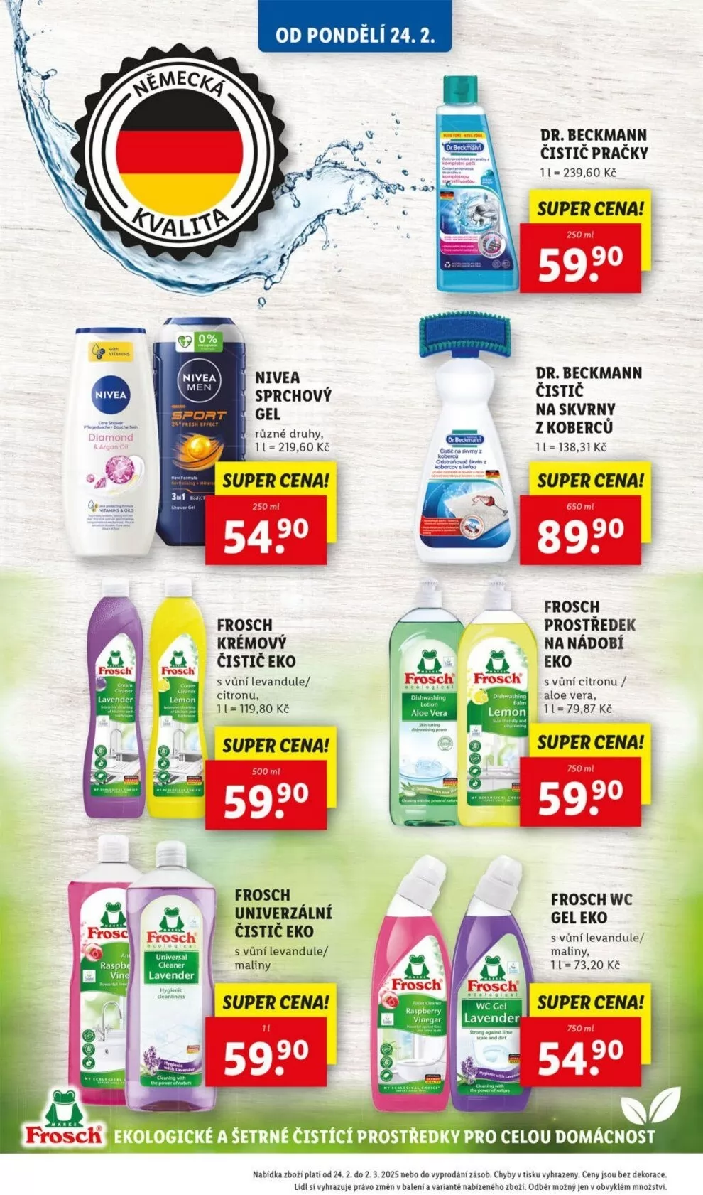 Od pondělí 24.2. v obchodě Lidl najdete širokou nabídku ekologických a šetrných čisticích prostředků pro celou domácnost. Mezi produkty se objevují sprchové gely Nivea v různých druzích za skvělou cenu 219,60 Kč. Dále nabízíme Frosch krémový čistič s vůní levandule a citronu za 119,80 Kč, univerzální čistič s vůní levandule a maliny za 119,80 Kč, a WC gel s levandulí za 73,20 Kč. Nezapomeňte také na Dr. Beckmann čistič pračky za 239,60 Kč a čistič na skvrny z koberců za 138,31 Kč. Tato nabídka platí do 2.3.2025 nebo do vyprodání zásob.