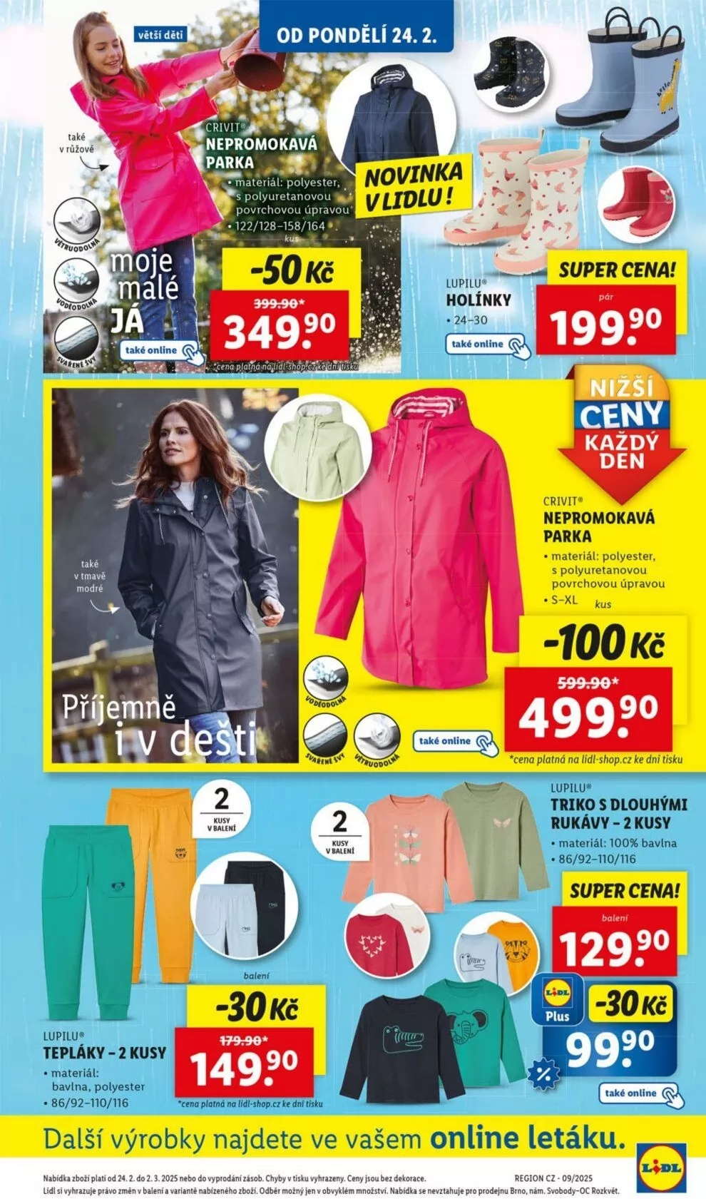 V letáku obchodu Lidl najdete skvělou nabídku pro větší děti! Od pondělí 24.2. si můžete pořídit novou nepromokavou parku značky Crivit, která je vyrobena z polyesteru s polyuretanovou povrchovou úpravou. Cena je nyní snížena o 50 Kč, takže ji pořídíte za 349 Kč.