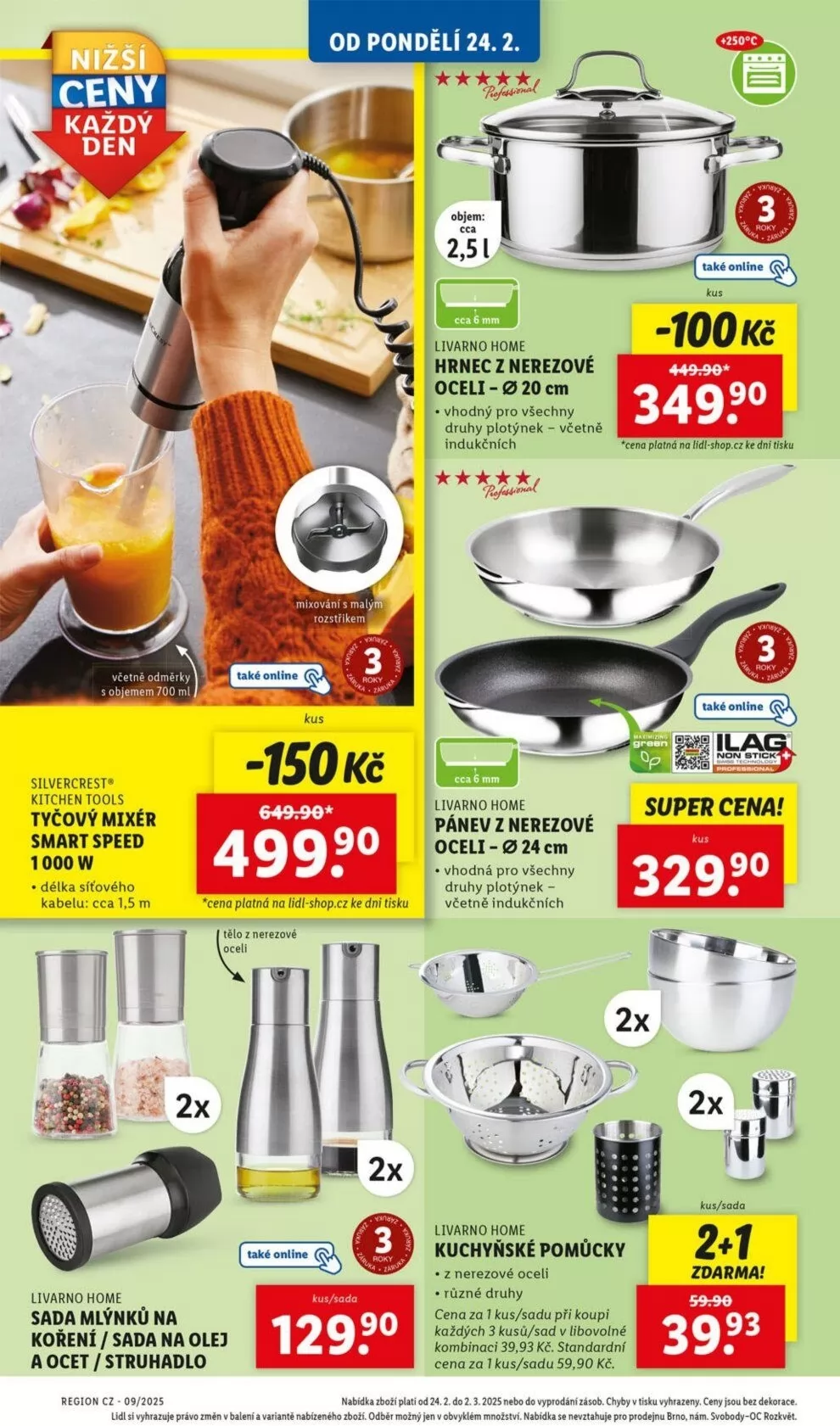 Od pondělí 24.2. v Lidlu najdete skvělé nabídky! Mezi nimi je tyčový mixér Silvercrest s výkonem 1000 W a délkou kabelu cca 1,5 m za cenu 499 Kč. Dále nabízíme hrnec a pánev z nerezové oceli Livarno Home, oba vhodné pro všechny typy plotýnek, včetně indukčních. Sada kuchyňských pomůcek z nerezové oceli zahrnuje mlýnky na koření, sadu na olej a ocet, a struhadlo. Při koupi 3 kusů/sad v libovolné kombinaci získáte cenu 39,93 Kč za kus. Akce platí do 2.3.2025 nebo do vyprodání zásob. Nezapomeňte, že ceny jsou bez dekorací a Lidl si vyhrazuje právo na změny v nabídce.