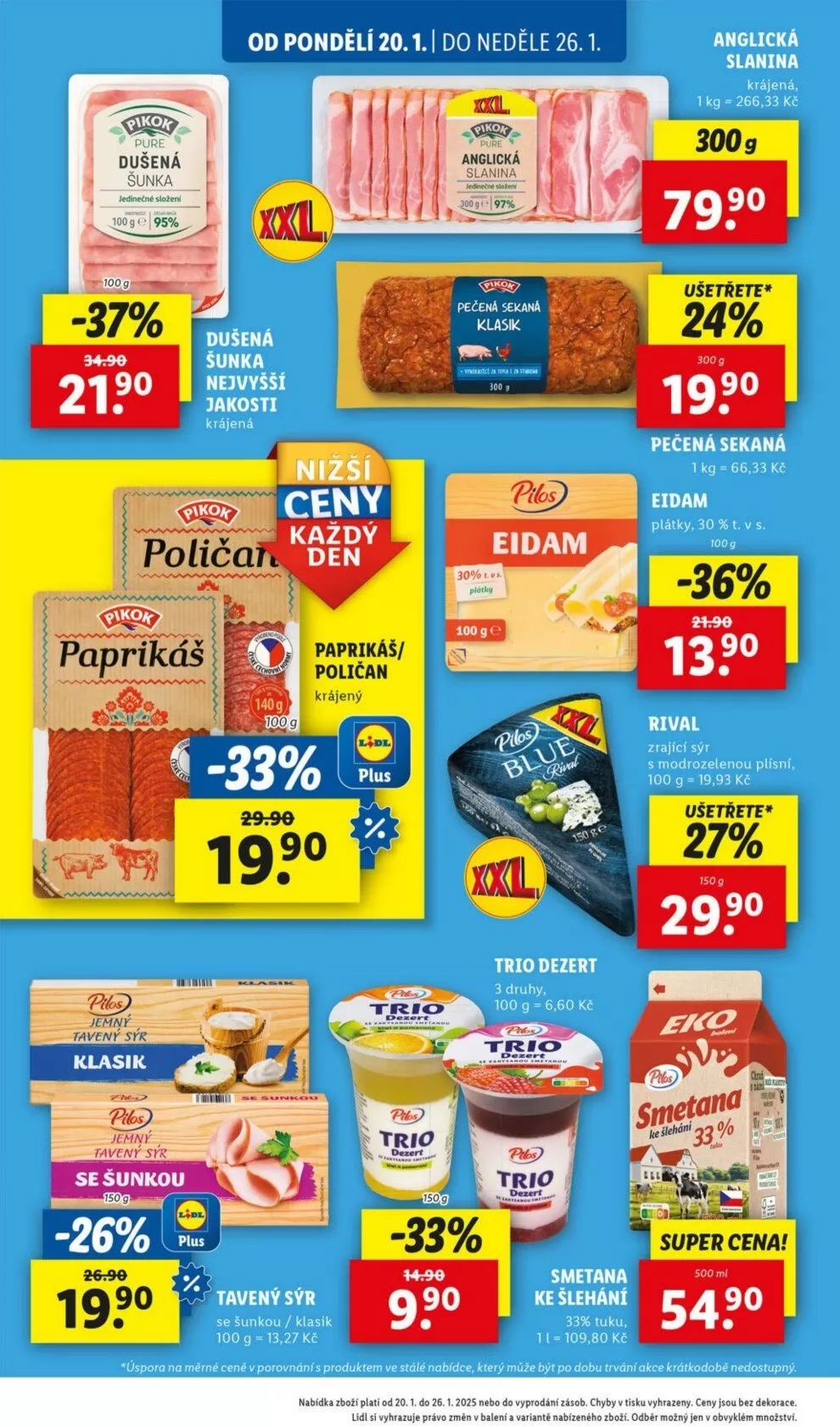 Od pondělí 20.1. do neděle 26.1. si v Lidlu můžete vybrat z široké nabídky kvalitních produktů. Na akci je anglická slanina a dušená šunka, které jsou nyní se slevou až 37%. Dále nabízíme krájenou šunku a tavené sýry, včetně jemného sýra se šunkou. Nezapomeňte na trio dezert s třemi druhy a smetanu ke šlehání s 33% tuku.