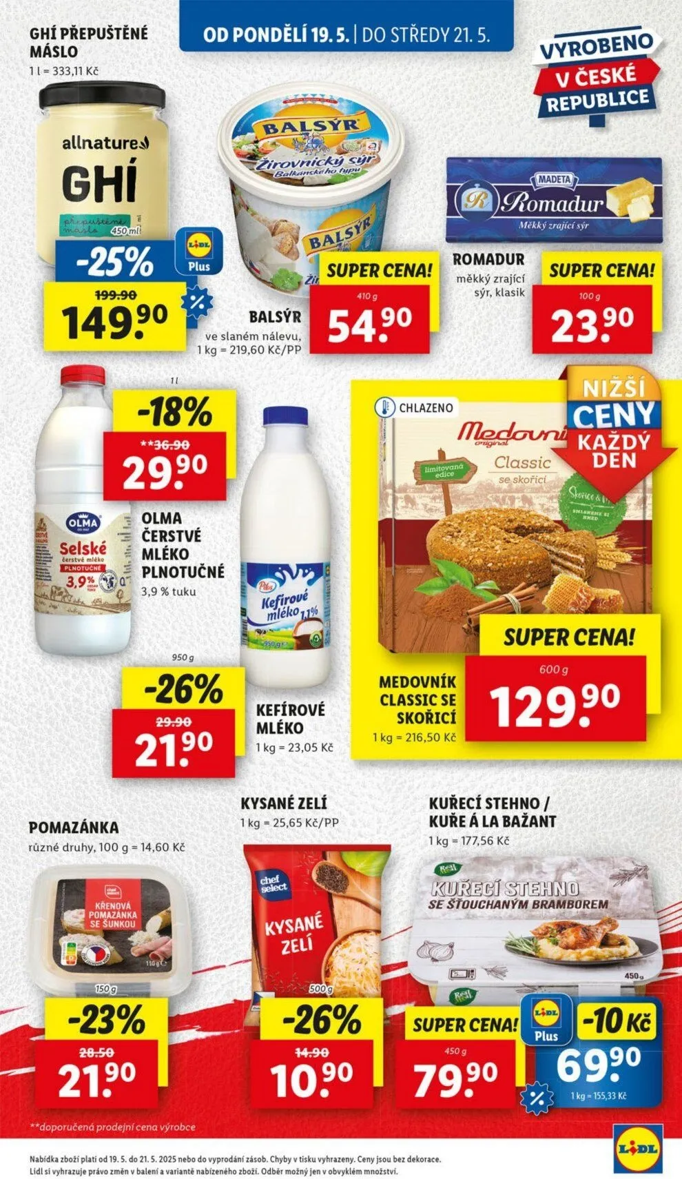 V letáku obchodu Lidl najdete skvělé produkty za výhodné ceny! Od pondělí 19.5. do středy 21.5. si můžete pořídit přepuštěné máslo ghí od značky Allnature za 1 333,11 Kč. Dále nabízíme měkký zrající sýr Romadur za super cenu 54,90 Kč za 410 g. Nezapomeňte také na čerstvé selské mléko Olma s 3,9 % tuku za 21,90 Kč za 950 g.