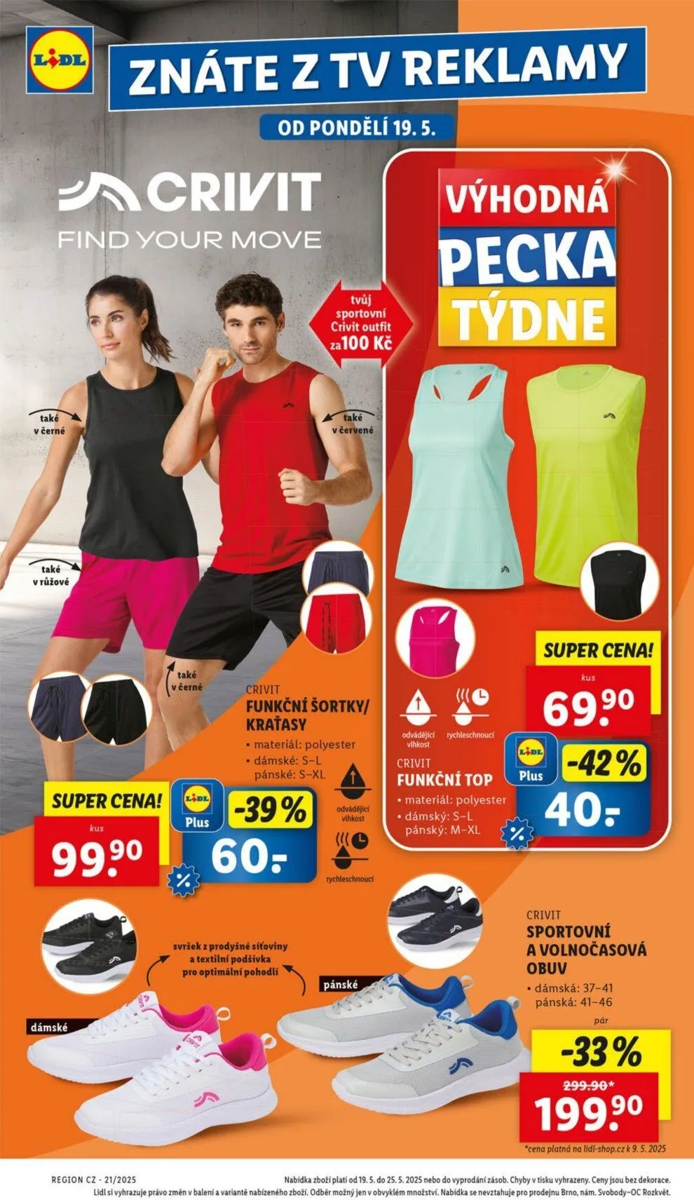 V letáku obchodu Lidl najdete skvělé produkty značky Crivit, které jsou ideální pro sportovní a volnočasové aktivity. Od pondělí 19.5. si můžete pořídit sportovní outfit za pouhých 100 Kč, dostupný v černé a růžové barvě. Dále nabízíme funkční šortky a kraťasy vyrobené z polyesteru, které jsou k dispozici v dámských velikostech S-L a pánských S-XL. Nezapomeňte také na funkční topy, které zajistí optimální pohodlí díky prodyšným materiálům. A pro vaše nohy máme sportovní a volnočasovou obuv v dámských velikostech 37-41 a pánských 41-46. Nabídka platí od 19.5. do 25.5.2025 nebo do vyprodání zásob. Nepropásněte tuto skvělou příležitost!
