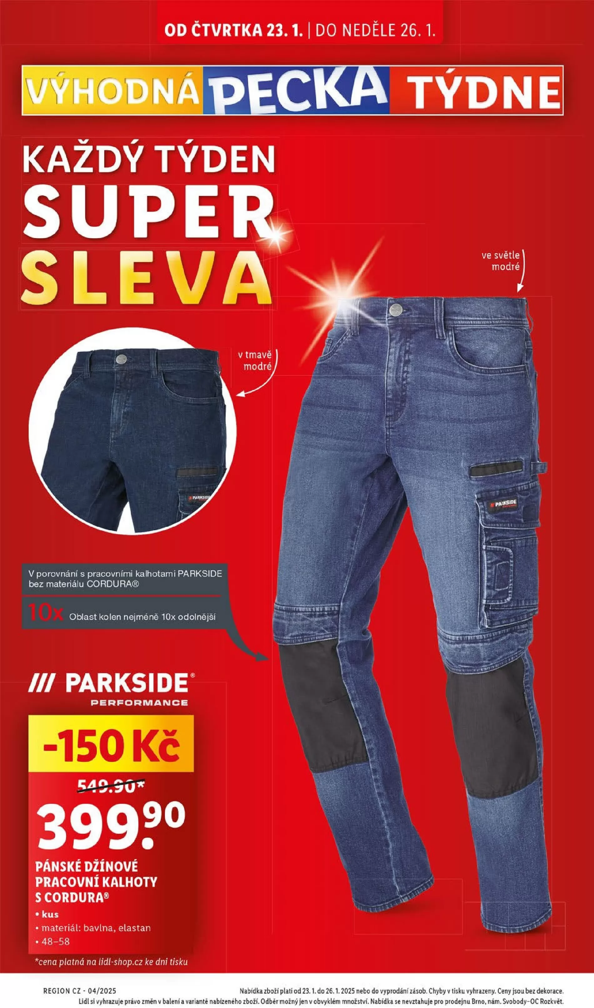 Od čtvrtka 23.1. do neděle 26.1. přichází Lidl s výhodnou nabídkou! Každý týden můžete využít super slevy na vybrané produkty. V letáku najdete pánské džínové pracovní kalhoty s materiálem Cordura, které jsou odolné a pohodlné. Oblast kolen je nejméně 10x odolnější, což zaručuje dlouhou životnost. Kalhoty jsou dostupné ve velikostech 48-58 a nyní za cenu 399 Kč, což je sleva 150 Kč. Nabídka platí do vyprodání zásob, tak neváhejte a přijďte si pro své nové pracovní kalhoty!