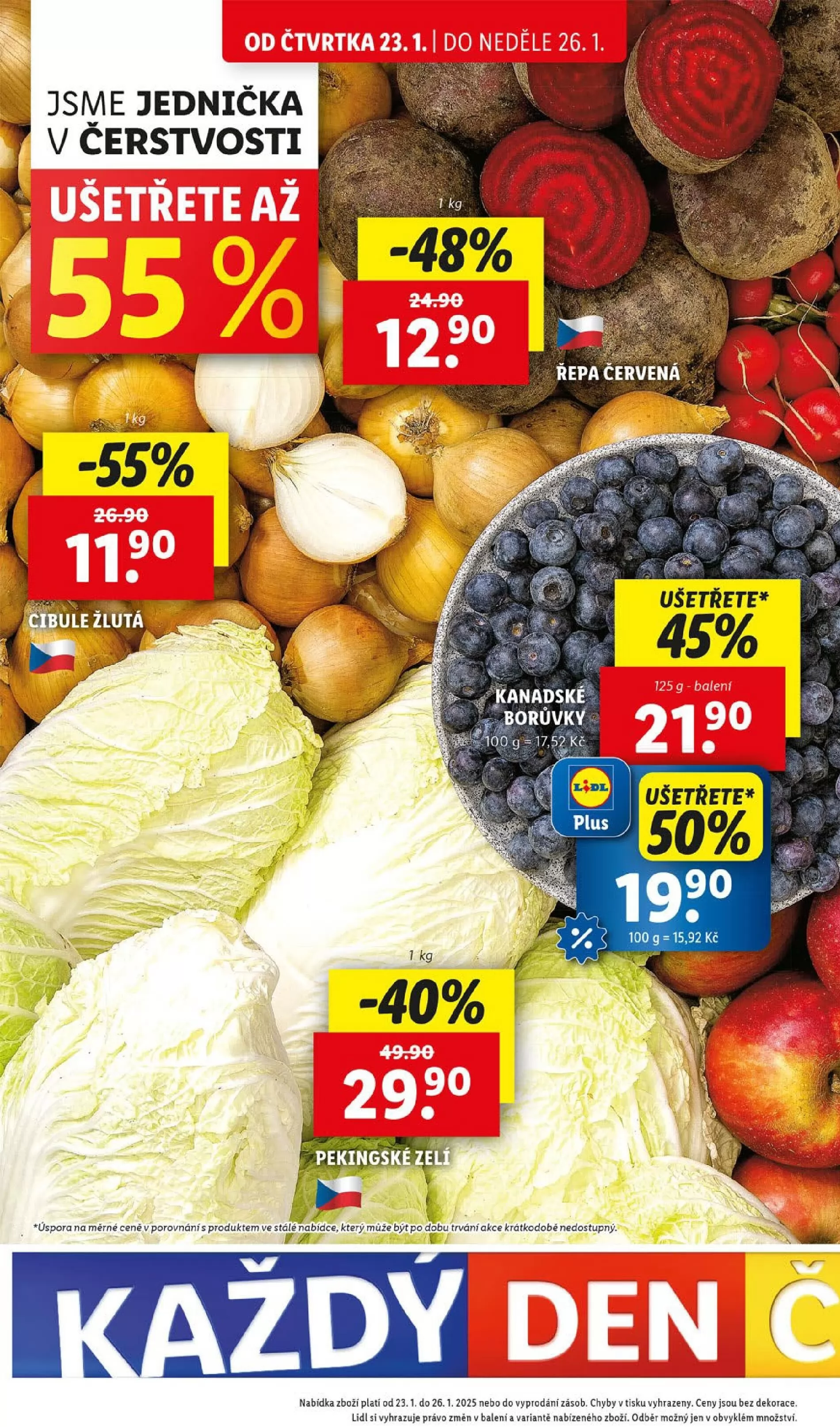 Od čtvrtka 23.1. do neděle 26.1. máte jedinečnou příležitost ušetřit až 55% na čerstvých produktech v obchodě Lidl! V nabídce najdete žlutou cibuli a červenou řepu, které jsou nyní za skvělé ceny. Také si nenechte ujít pekingské zelí, které je k dostání se slevou 40%. Nezapomeňte, že akce platí do vyprodání zásob. Přijďte si pro čerstvé potraviny a ušetřete!