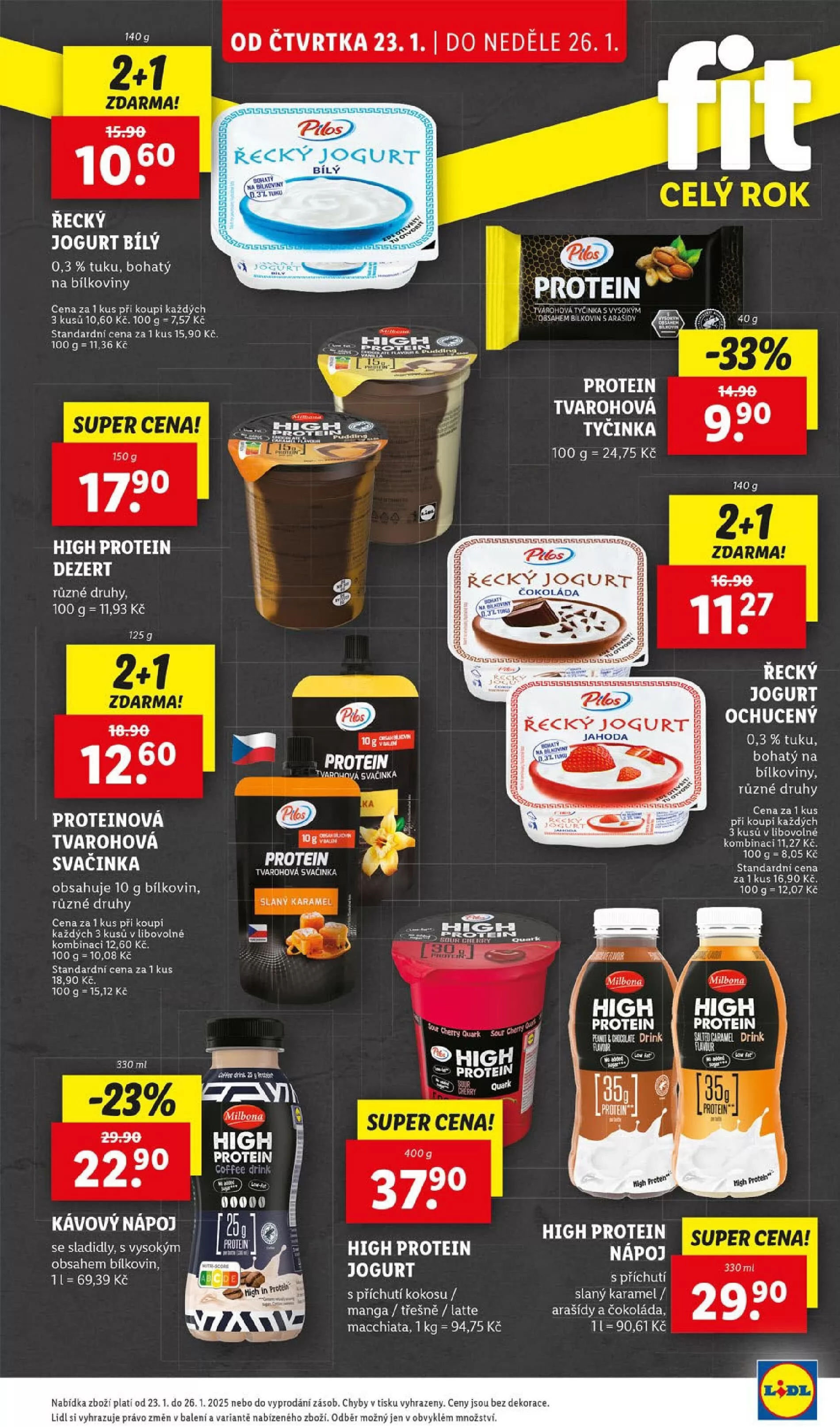Nabídka zahrnuje také 330 ml kávový nápoj s vysokým obsahem bílkovin a 400 g high protein jogurt s příchutí kokosu, manga, třešně nebo latte macchiata. Nezapomeňte také na ochucený 140g řecký jogurt, který je k dostání za výhodnou cenu při koupi více kusů. Akce platí od 23.1. do 26.1.2025 nebo do vyprodání zásob.