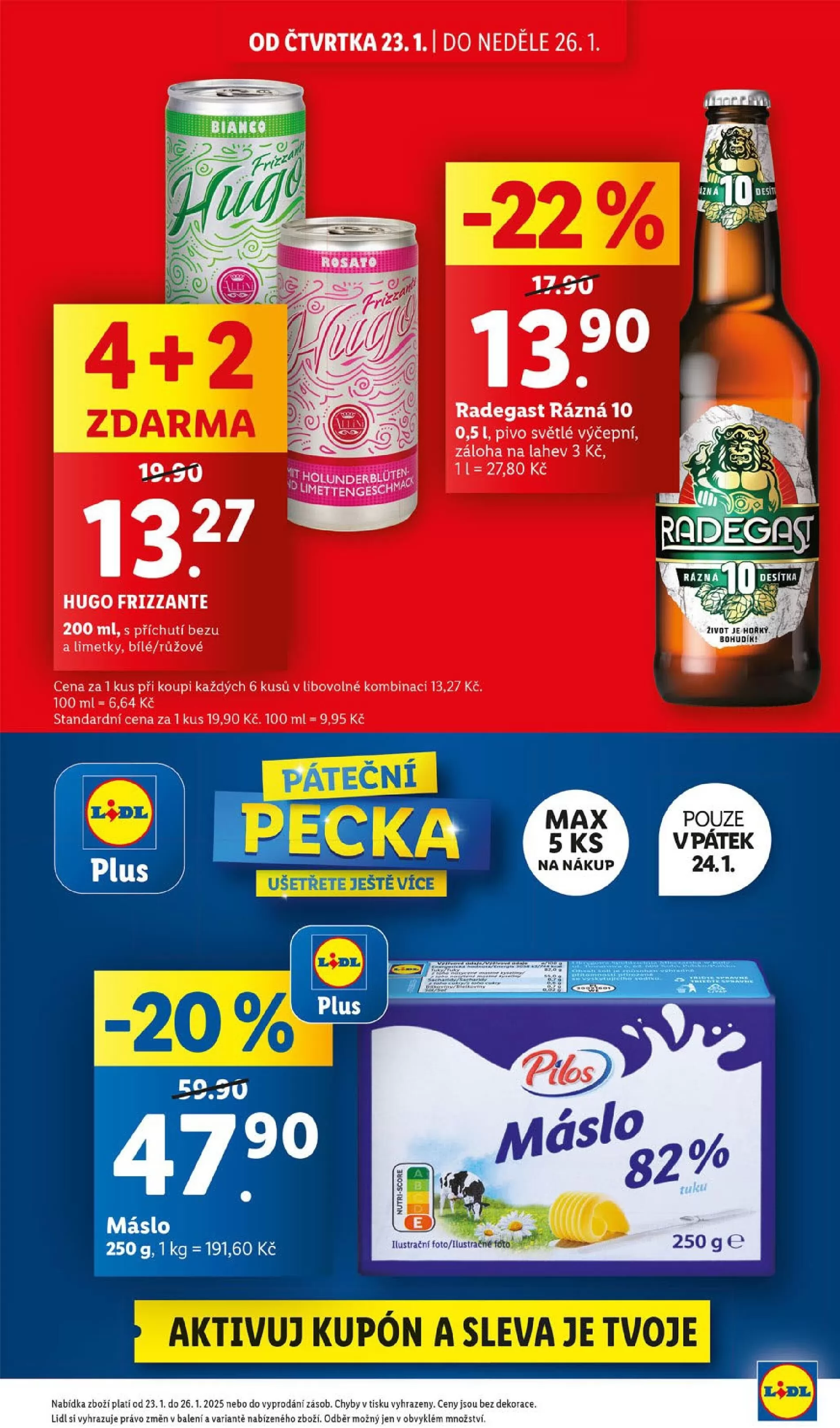 Od čtvrtka 23.1. do neděle 26.1. si v Lidlu můžete vybrat z široké nabídky produktů. Mezi nimi najdete pivo Radegast Rázná 0,5 l za 27,80 Kč, s vratnou zálohou na lahev 3 Kč. Dále je v akci Hugo Frizzante 200 ml s příchutí bezu a limetky, jehož cena při koupi 6 kusů klesá na 13,27 Kč za kus. Máslo 250 g je k dostání za 47,90 Kč, což odpovídá ceně 191,60 Kč za kilogram. Nezapomeňte aktivovat kupón a využít slevy! Nabídka platí do vyprodání zásob.
