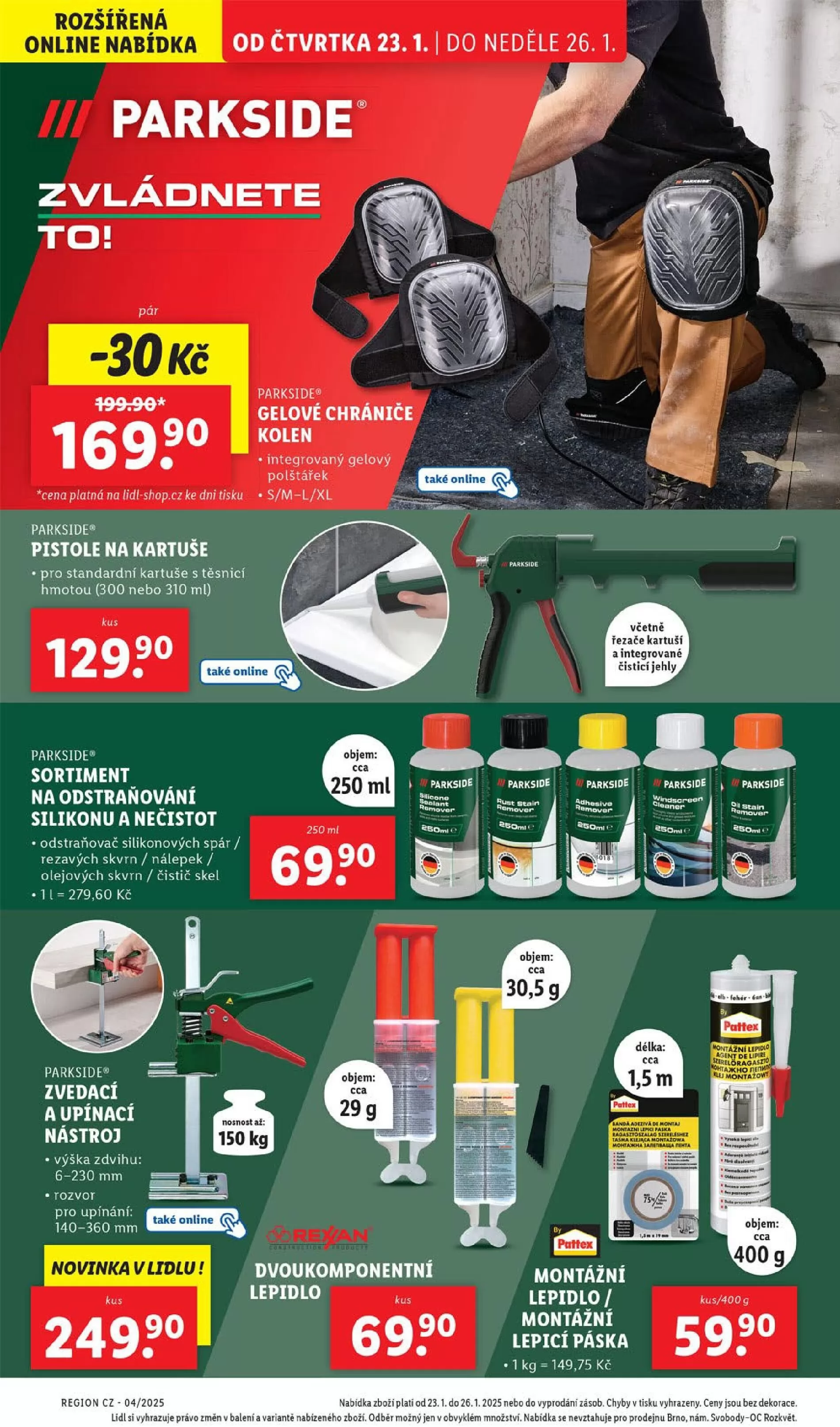 V letáku obchodu Lidl najdete širokou nabídku produktů značky Parkside, které jsou k dispozici od čtvrtka 23. ledna do neděle 26. ledna. Mezi novinkami se objevují gelové chrániče za 169 Kč a pistole na kartuše, ideální pro standardní kartuše s těsnicí hmotou. Dále nabízíme odstraňovač silikonových spár a čistič skel za 279,60 Kč.