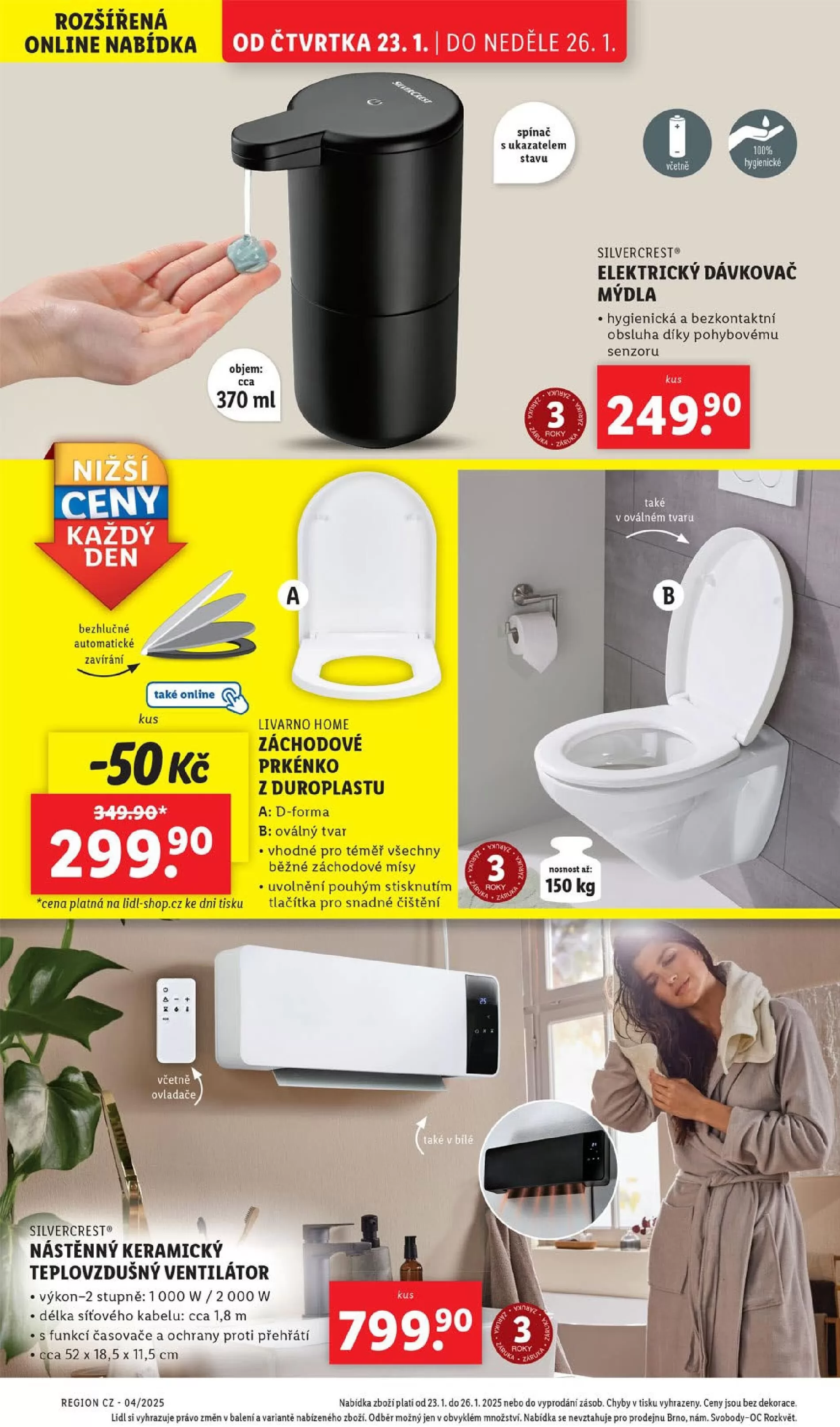 V letáku obchodu Lidl najdete rozšířenou online nabídku, která platí od čtvrtka 23. do neděle 26. ledna. Mezi zajímavé produkty patří hygienický elektrický dávkovač mýdla s bezkontaktní obsluhou díky pohybovému senzoru, který je k dispozici za 249 Kč. Dále nabízíme záchodové prkénko z duroplastu v různých tvarech, které je snadno udržovatelné a vhodné pro většinu běžných záchodových mís.
