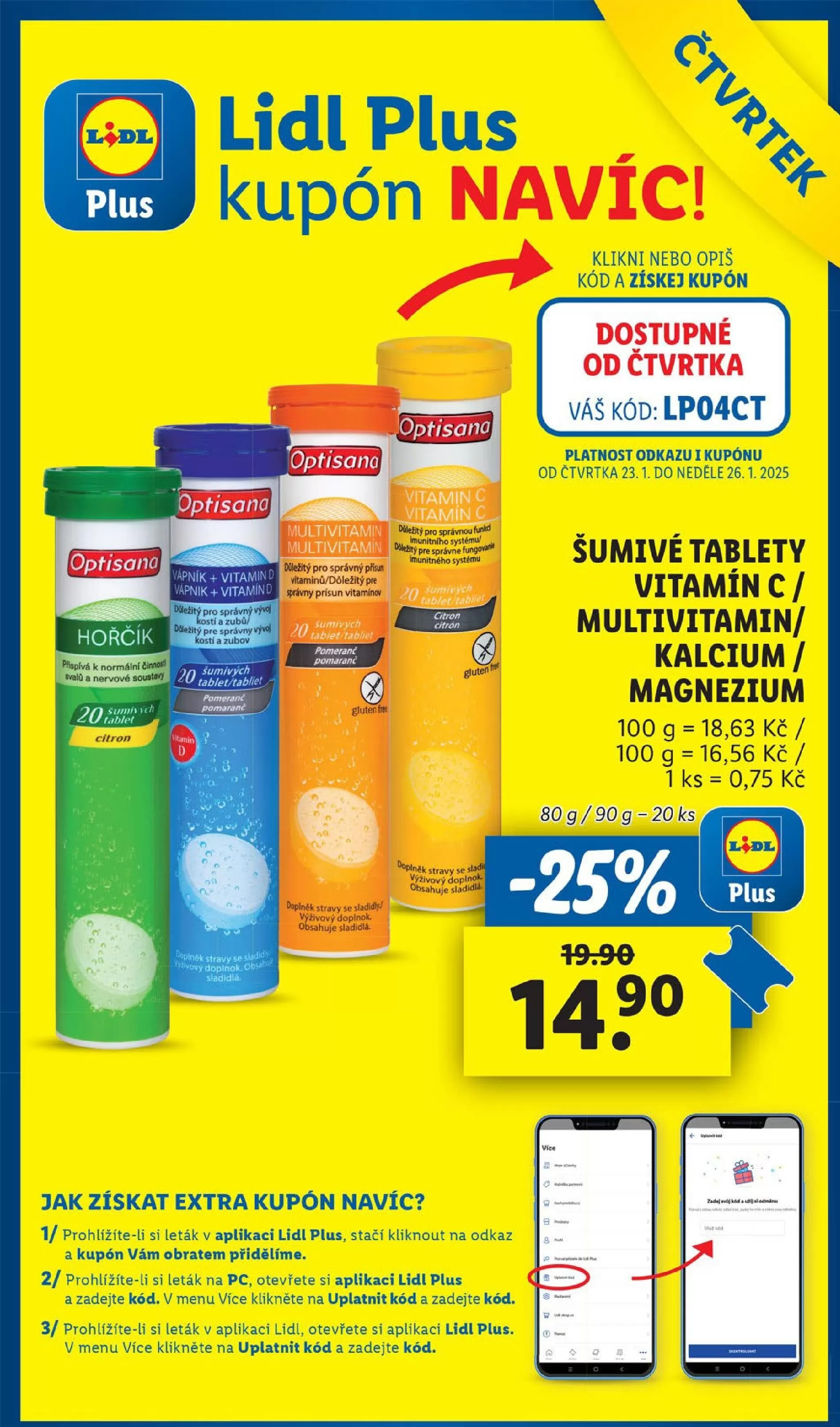 Nezapomeňte využít speciální kupón, který můžete získat prostřednictvím aplikace Lidl Plus. Stačí kliknout na odkaz nebo zadat kód a získáte tak extra slevu na vybrané produkty. Kupón je platný od čtvrtka 23.1. do neděle 26.1.2025. Využijte této skvělé příležitosti a obohaťte svou stravu o důležité vitamíny a minerály!