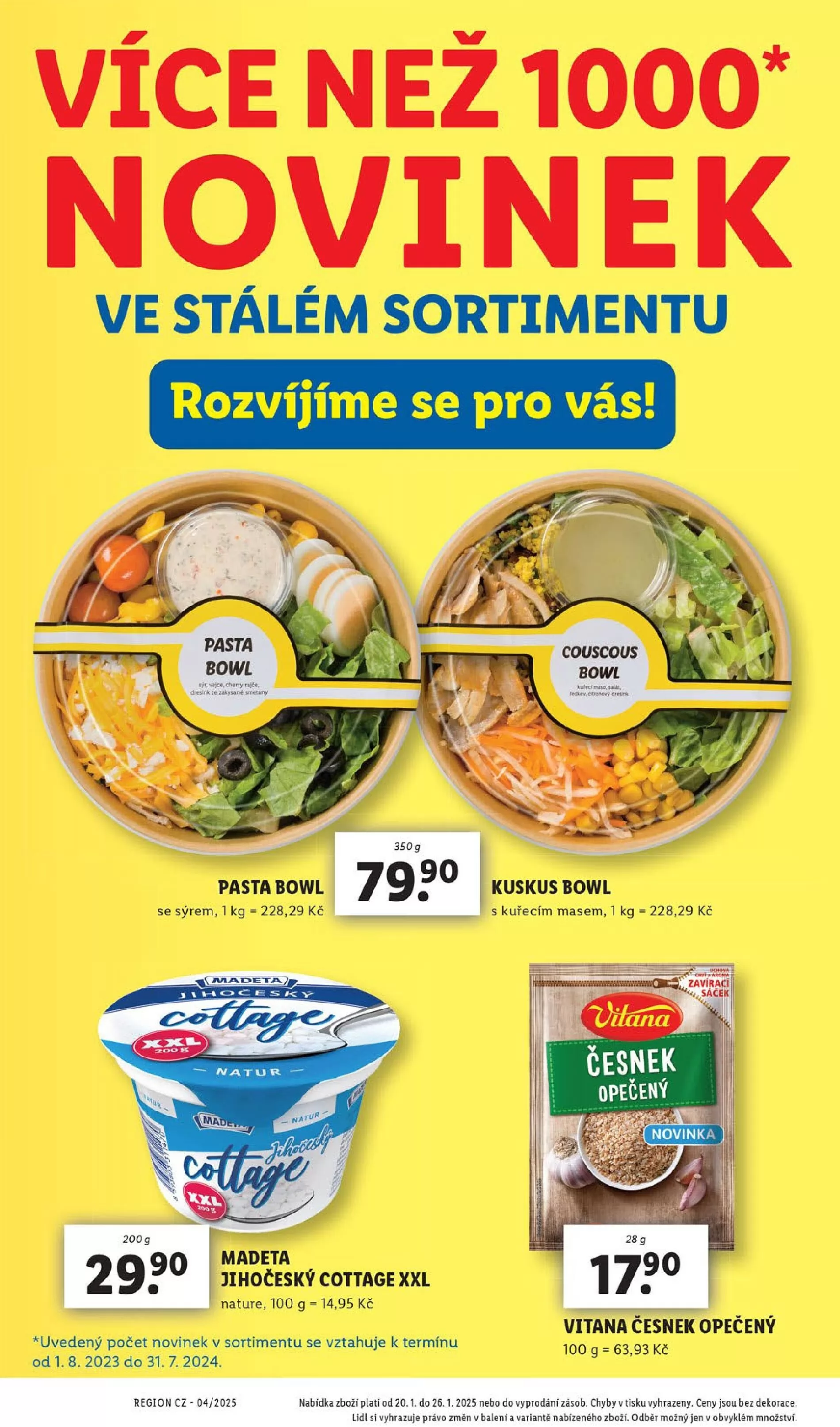 V letáku obchodu Lidl najdete více než 1000 novinek ve stálém sortimentu, které jsme pro vás připravili. Mezi zajímavé produkty patří pasta bowl se sýrem (1 kg za 228,29 Kč) a kuskus bowl s kuřecím masem (1 kg také za 228,29 Kč). Dále nabízíme jihočeský cottage XXL (100 g za 14,95 Kč) a opečený česnek od Vitany (28 g za 63,93 Kč). Nabídka platí od 20.1. do 26.1.2025 nebo do vyprodání zásob. Nezapomeňte, že ceny jsou bez dekorace a Lidl si vyhrazuje právo na změny v balení a variantách nabízeného zboží.