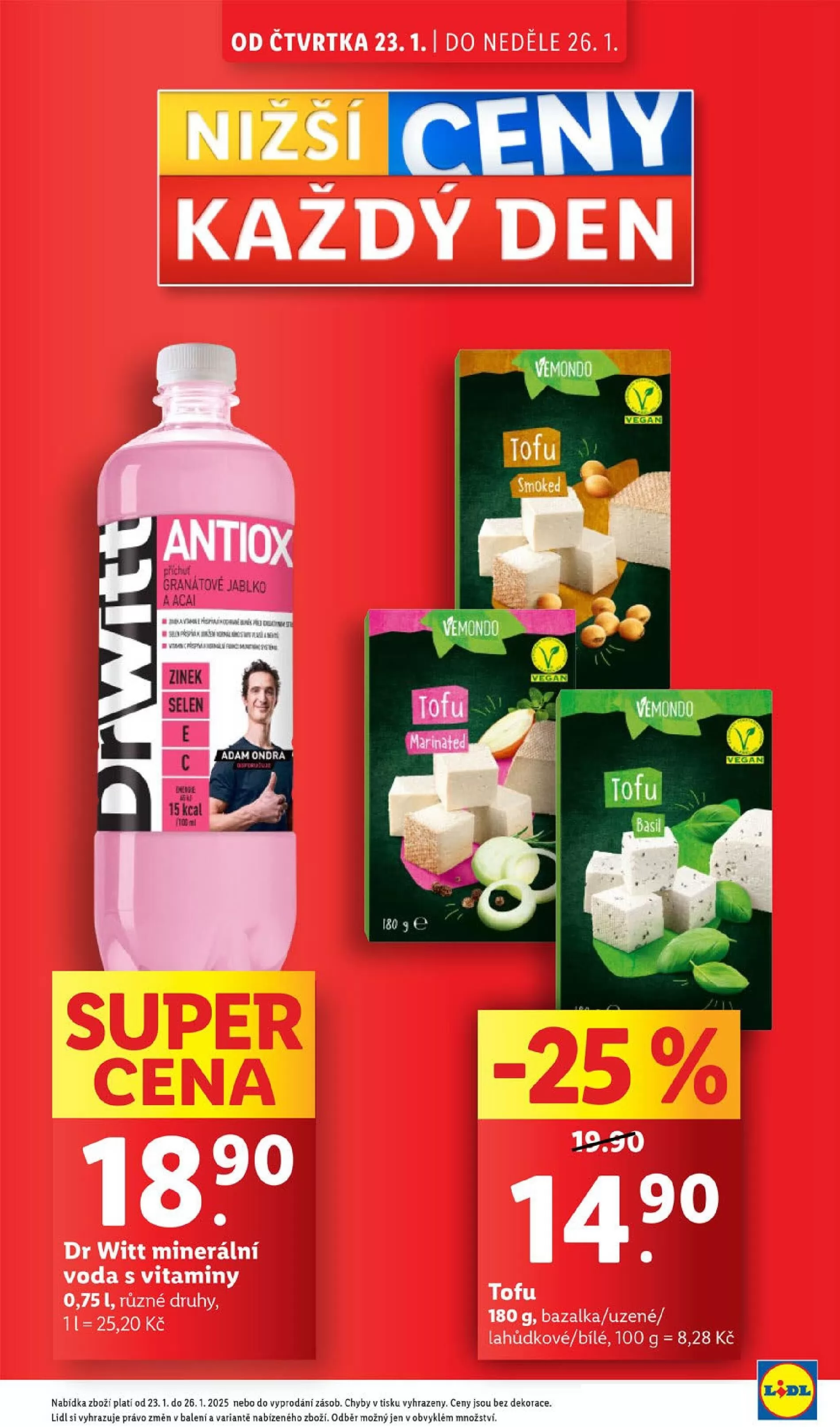 Od čtvrtka 23.1. do neděle 26.1. máte možnost zakoupit skvělé produkty v obchodu Lidl. Mezi nimi najdete minerální vodu Dr. Witt s vitaminy, která je k dispozici v různých druzích za super cenu 25,20 Kč za 0,75 l. Dále nabízíme tofu v několika variantách – bazalka, uzené, lahůdkové a bílé, přičemž cena za 180 g je 8,28 Kč. Nezapomeňte, že nabídka platí do vyprodání zásob. Těšíme se na vaši návštěvu!