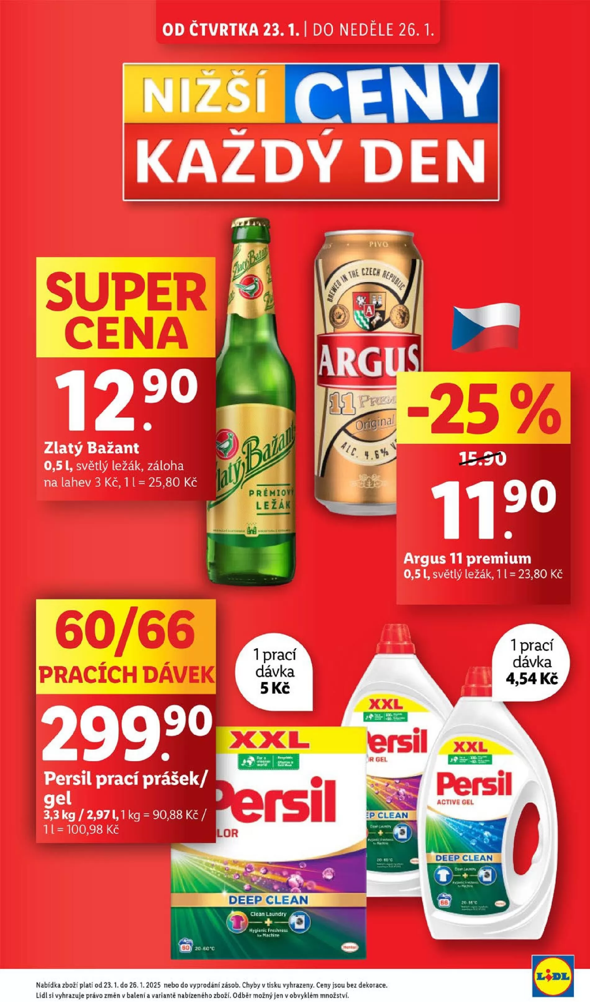 Od čtvrtka 23.1. do neděle 26.1. máte možnost využít skvělé nabídky v obchodě Lidl. Mezi hlavními produkty najdete světlý ležák Zlatý Bažant 0,5 l za super cenu 25,80 Kč, včetně zálohy na lahev 3 Kč. Dále je v akci prací prášek a gel Persil, který nabízí 3,3 kg za 90,88 Kč, což vychází na 4,54 Kč za jednu prací dávku. Nezapomeňte také na prémiový ležák Argus, který je k dostání za 23,80 Kč. Tato nabídka platí do vyprodání zásob, tak neváhejte a přijďte si pro své oblíbené produkty!