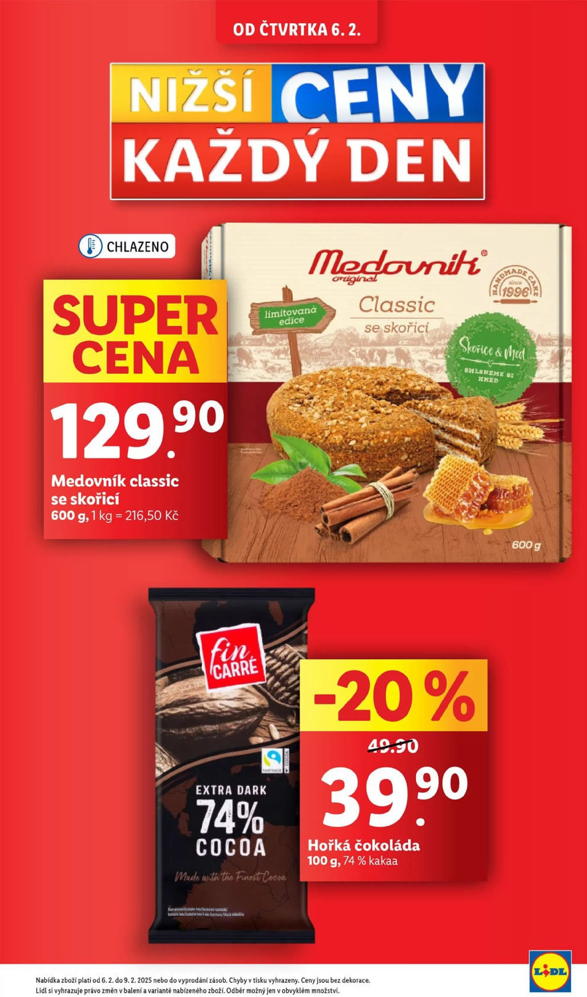 Od čtvrtka 6. února v obchodě Lidl najdete limitovanou edici produktů. Mezi nimi se objevuje medovník classic se skořicí o hmotnosti 600 g, jehož cena je 129,90 Kč (1 kg = 216,50 Kč). Dále je v nabídce hořká čokoláda extra dark s 74 % kakaa, která je nyní za akční cenu 39,90 Kč (původně 49,90 Kč) za 100 g. Nabídka platí do 9. února 2025 nebo do vyprodání zásob. Ceny jsou uvedeny bez dekorace a Lidl si vyhrazuje právo na změny v balení a variantách nabízeného zboží. Odběr je možný pouze v obvyklém množství.
