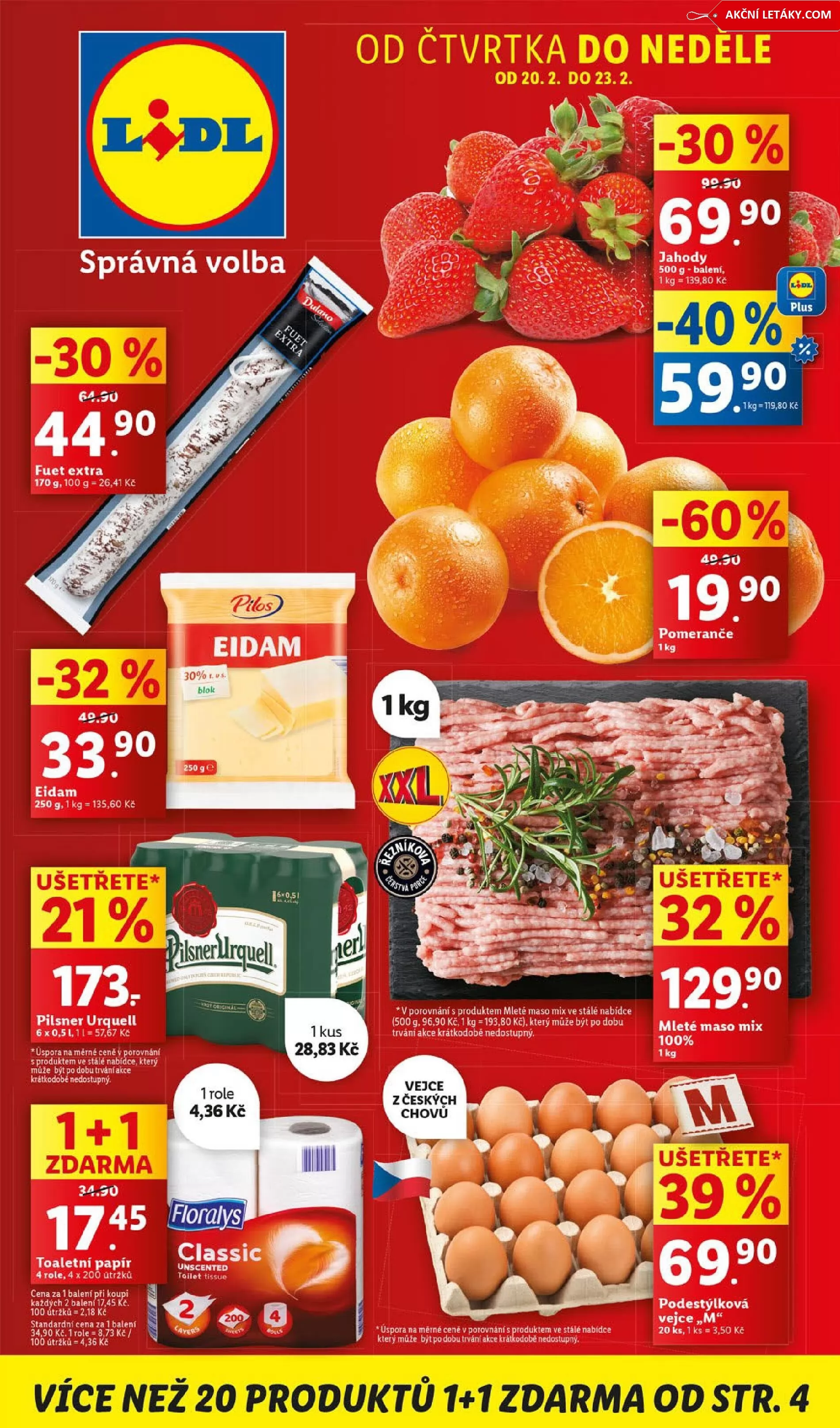 V letáku obchodu Lidl najdete širokou nabídku produktů za skvělé ceny. Od čtvrtka do neděle, od 20.2. do 23.2., můžete ušetřit na různých potravinách. Například jahody v 500 g balení za 139,80 Kč nebo pomeranče s 60% slevou.