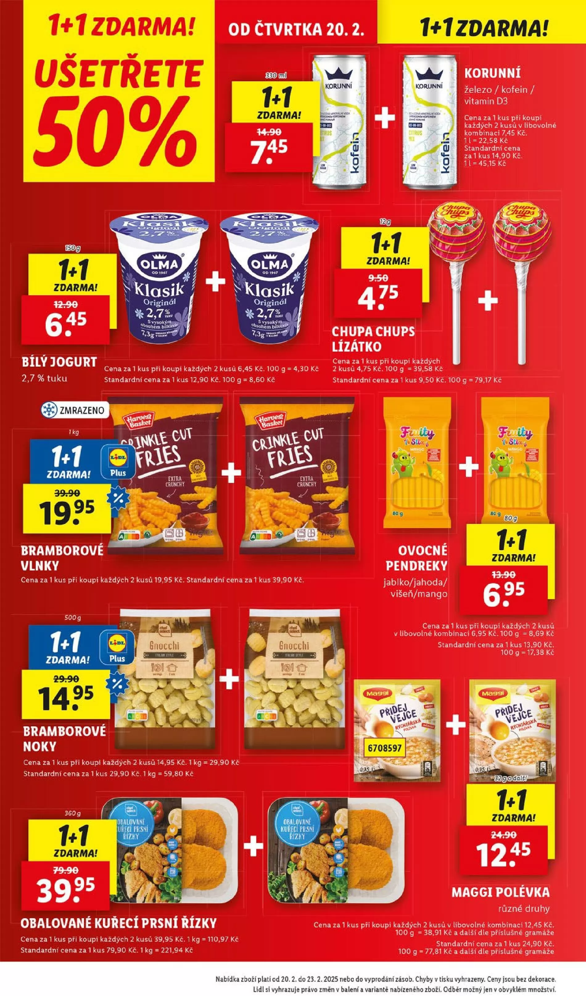 V letáku obchodu Lidl najdete skvělé akční nabídky, které platí od čtvrtka 20.2. Ušetřete s produkty jako Korunní, kde při koupi každých dvou kusů získáte cenu 7,45 Kč za kus. Dále si můžete vychutnat bílý jogurt Olma s akcí 1+1 zdarma, kde cena za kus při koupi dvou činí 6,45 Kč.
