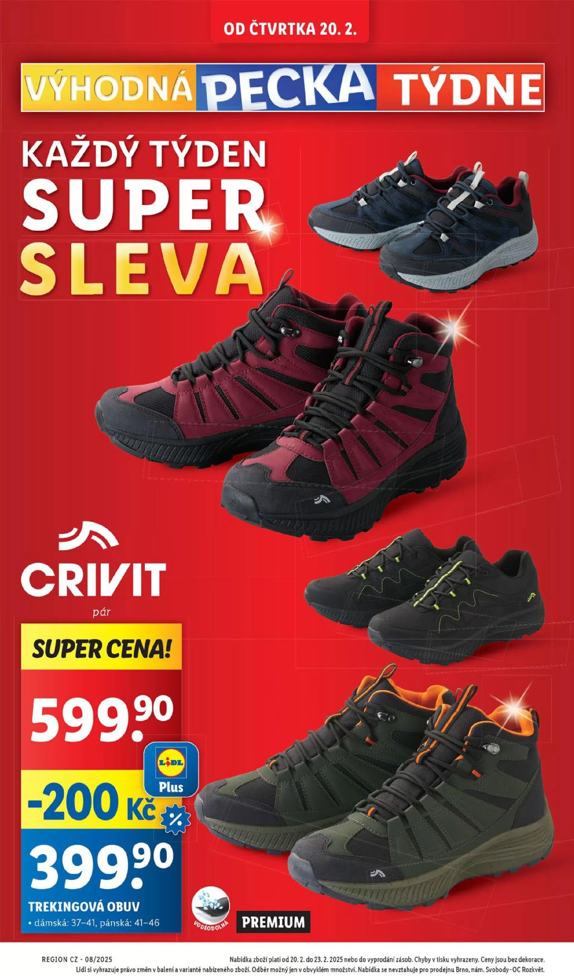 Od čtvrtka 20. února přichází Lidl s výhodnou nabídkou! Každý týden můžete využít super slevy na vybrané produkty. V aktuálním letáku najdete trekingovou obuv za skvělou cenu – dámské velikosti 37-41 a pánské 41-46. Nepropásněte tuto příležitost, platí od 20. do 23. února 2025 nebo do vyprodání zásob. Ceny jsou uvedeny bez dekorace a Lidl si vyhrazuje právo na změny v balení a variantách nabízeného zboží. Odběr je možný pouze v obvyklém množství. Těšíme se na vaši návštěvu!