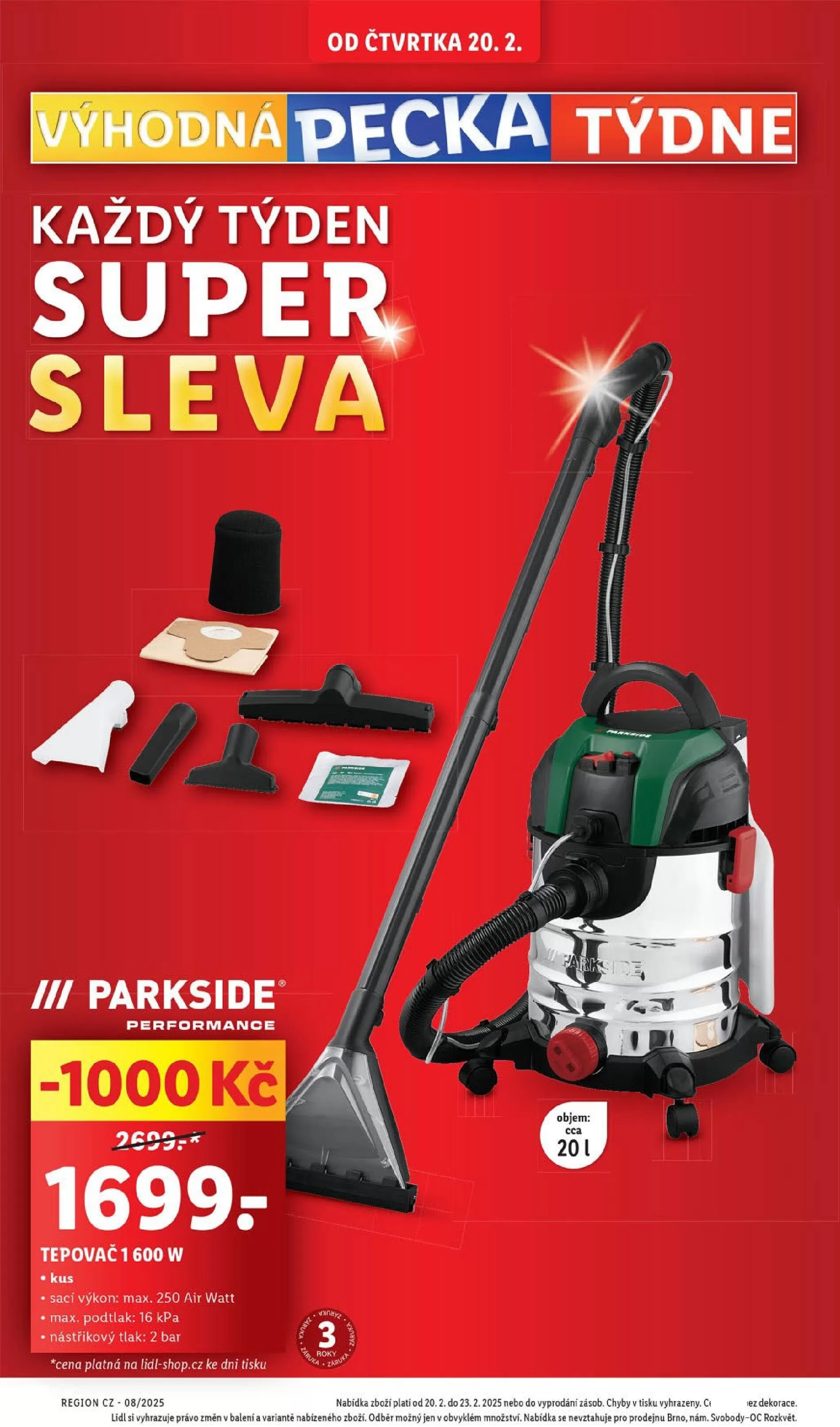 Od čtvrtka 20. února přichází Lidl s výhodnou nabídkou! Každý týden můžete využít super slevy na vybrané produkty. Mezi nimi najdete tepovač Parksider s výkonem 600 W za skvělou cenu 1699 Kč, což je sleva 1000 Kč. Tento tepovač má sací výkon až 250 air wattů a maximální podtlak 16 kPa, což zaručuje efektivní úklid. Nabídka platí od 20. do 23. února 2025 nebo do vyprodání zásob. Nezapomeňte, že Lidl si vyhrazuje právo na změny v balení a variantách nabízeného zboží. Těšíme se na vaši návštěvu!