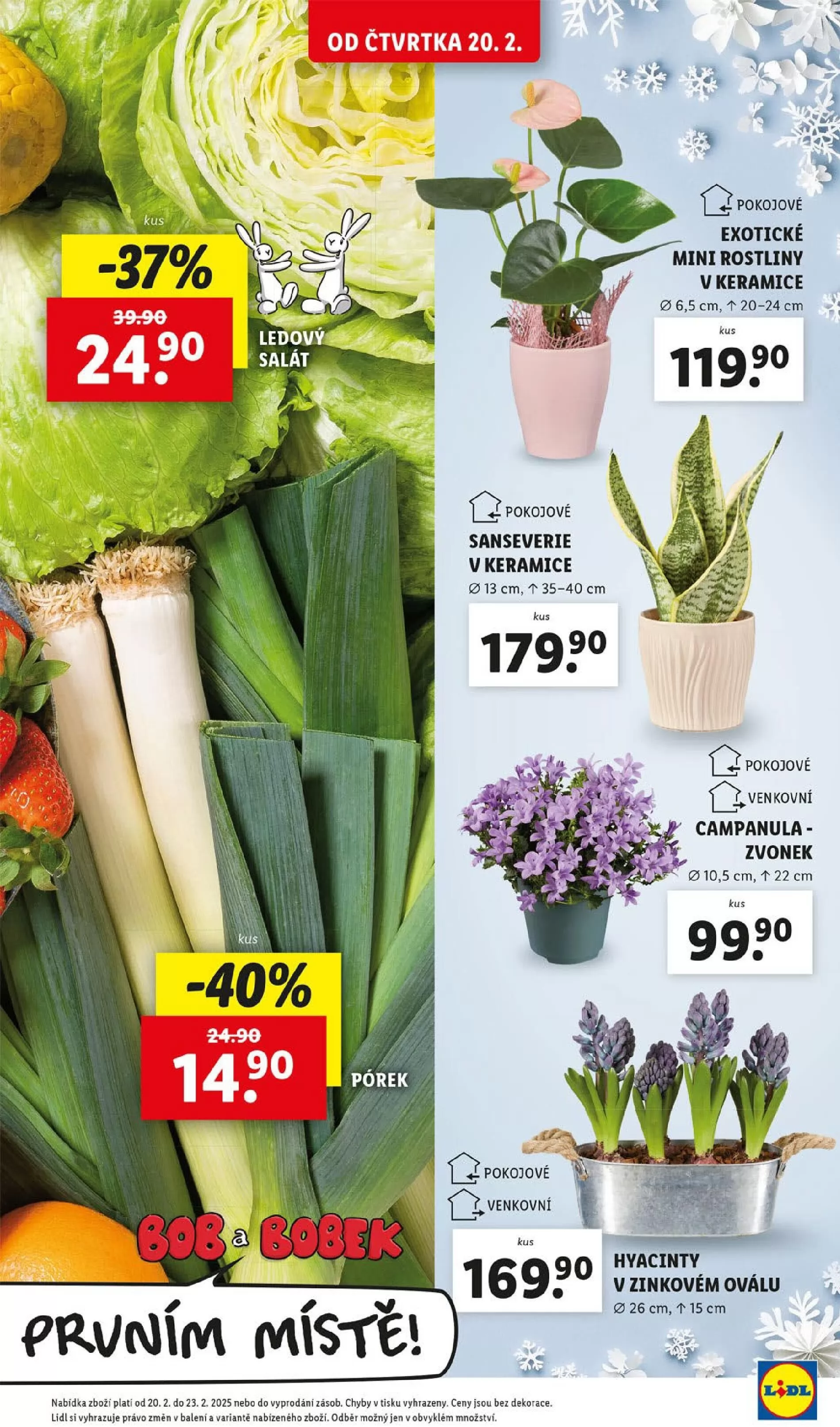 V letáku obchodu Lidl najdete skvělou nabídku produktů, které potěší každého. Od čtvrtka 20.2. si můžete pořídit ledový salát se slevou 37%, který je ideální pro osvěžující saláty. Dále nabízíme pokojové sanseverie v keramice o výšce 35-40 cm za 169 Kč. Pro milovníky rostlin máme také exotické mini rostliny v keramice, které měří 20-24 cm, a to za skvělou cenu. Nezapomeňte na campanulu - zvonek, která je k dostání v různých velikostech. A pro jarní atmosféru si můžete pořídit hyacinty v zinkovém oválu. Nabídka platí od 20.2. do 23.2. 2025 nebo do vyprodání zásob.