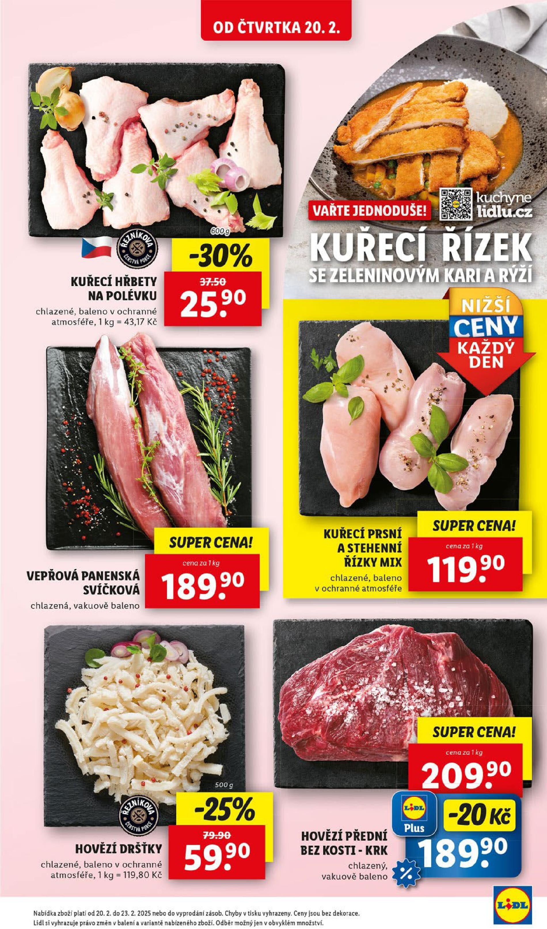 Od čtvrtka 20.2. v obchodech Lidl najdete skvělou nabídku produktů pro vaši kuchyni. Mezi nimi jsou chlazené kuřecí hřbety na polévku, balené v ochranné atmosféře, za cenu 43,17 Kč za kilogram. Dále si můžete pořídit vepřovou panenskou svíčkovou, vakuově balenou, a hovězí dršťky, které jsou také chlazené a balené v ochranné atmosféře, za 119,80 Kč za kilogram.