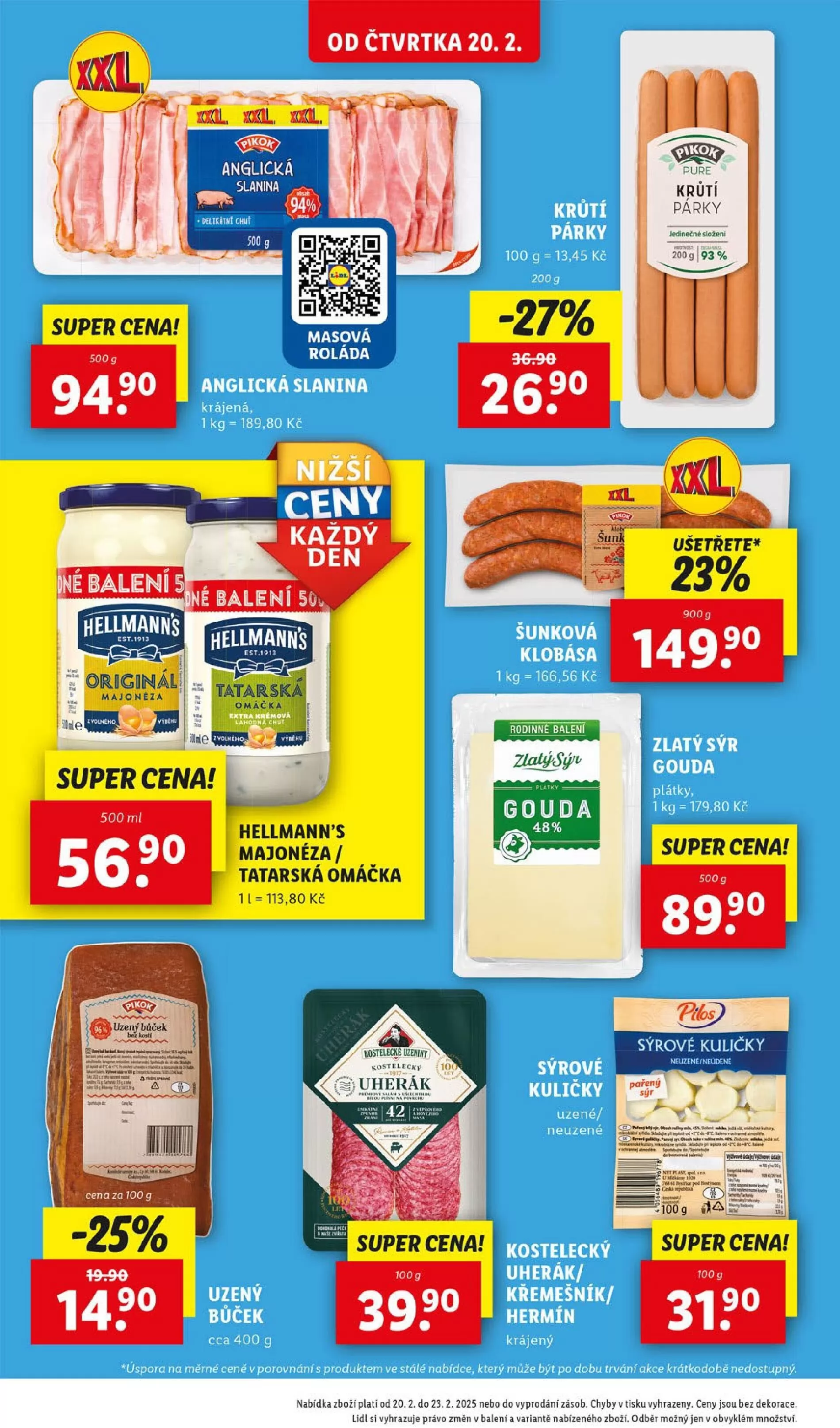 V letáku obchodu Lidl najdete skvělé nabídky na různé produkty! Od čtvrtka 20.2. si můžete pořídit anglickou slaninu v balení 500 g za super cenu. Dále nabízíme krůtí párky, které stojí 13,45 Kč za 100 g, a masovou roládu. Nezapomeňte na šunkovou klobásu, jejíž cena je 166,56 Kč za 1 kg.