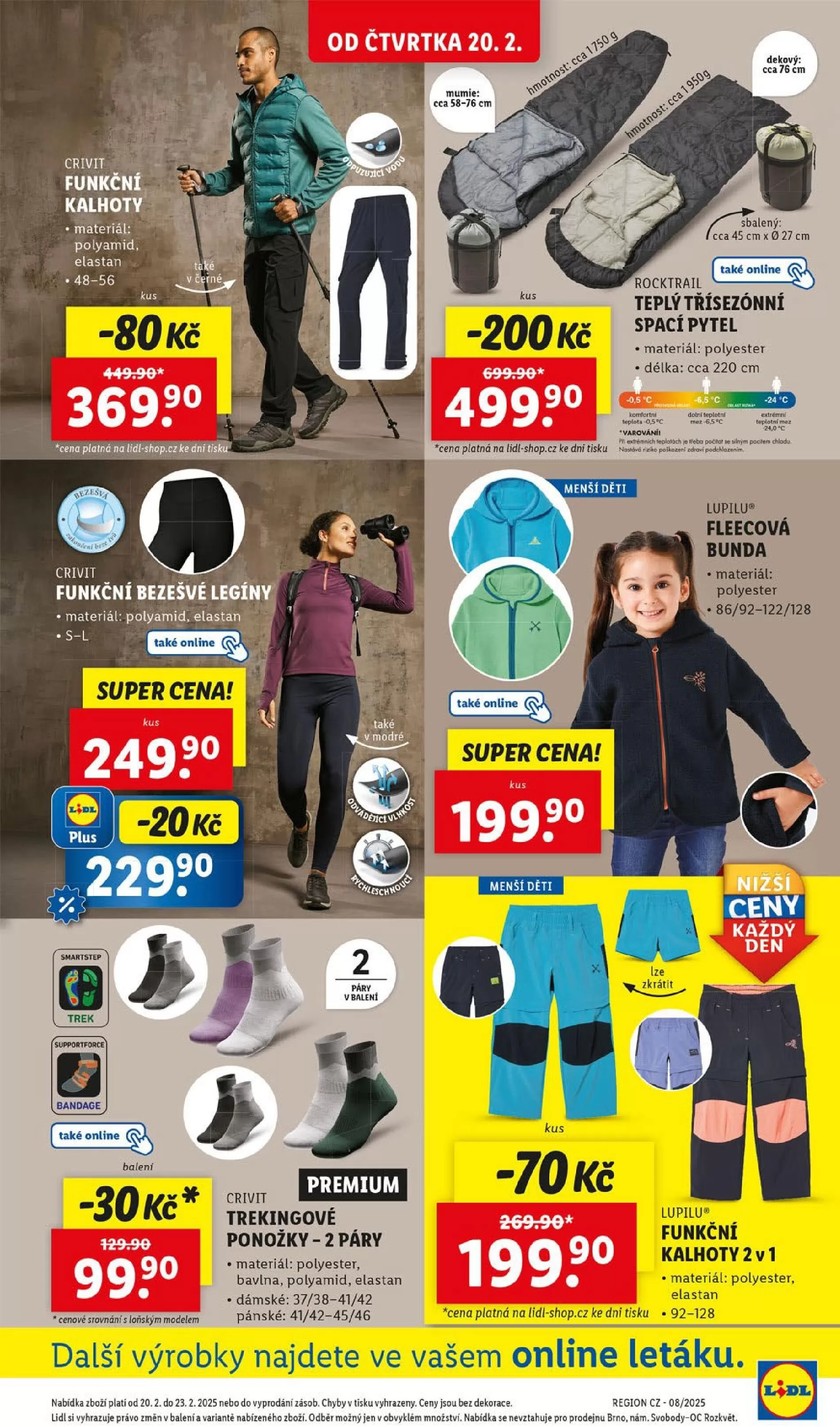 V letáku obchodu Lidl najdete širokou nabídku funkčního oblečení a outdoorového vybavení. Mezi produkty se objevují funkční kalhoty a bezešvé legíny vyrobené z kvalitního polyamidu a elastanu, které jsou nyní za super cenu. Dále nabízíme teplý třísezónní spací pytel z polyesteru, ideální pro vaše outdoorové výlety. Nezapomeňte také na fleecovou bundu, která je dostupná v různých velikostech a barvách. Pro aktivní jedince máme v nabídce trekingové ponožky ve dvou párech, které zaručují pohodlí během vašich dobrodružství. Všechny produkty jsou k dispozici online a platnost nabídky je od 20.2. do 23.2.2025 nebo do vyprodání zásob.