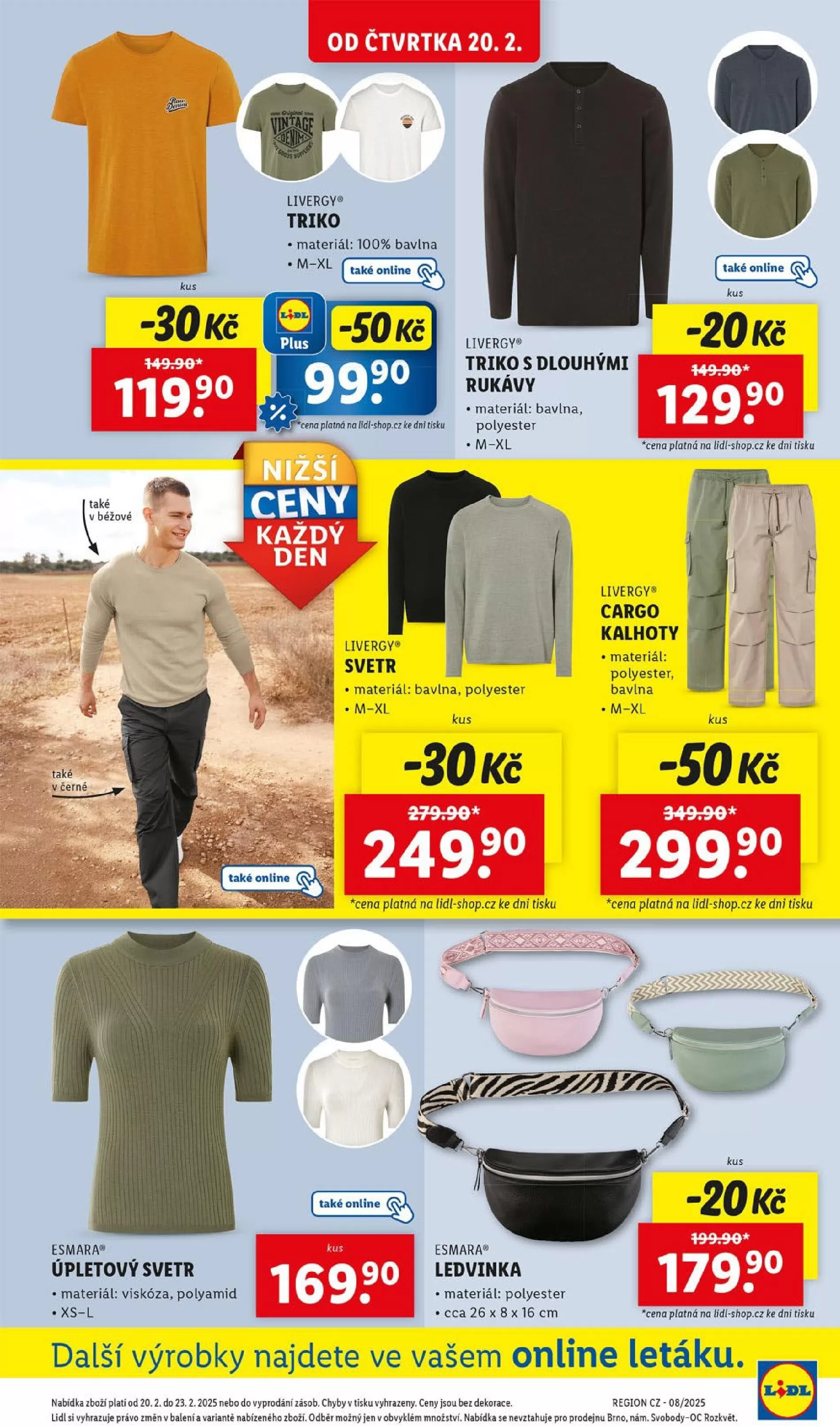 A nezapomeňte na cargo kalhoty Livergy, vyrobené z polyesteru a bavlny, nyní za -50 Kč. Všechny produkty jsou také dostupné online. Nabídka platí od 20.2. do 23.2.2025 nebo do vyprodání zásob. Těšíme se na vaši návštěvu!