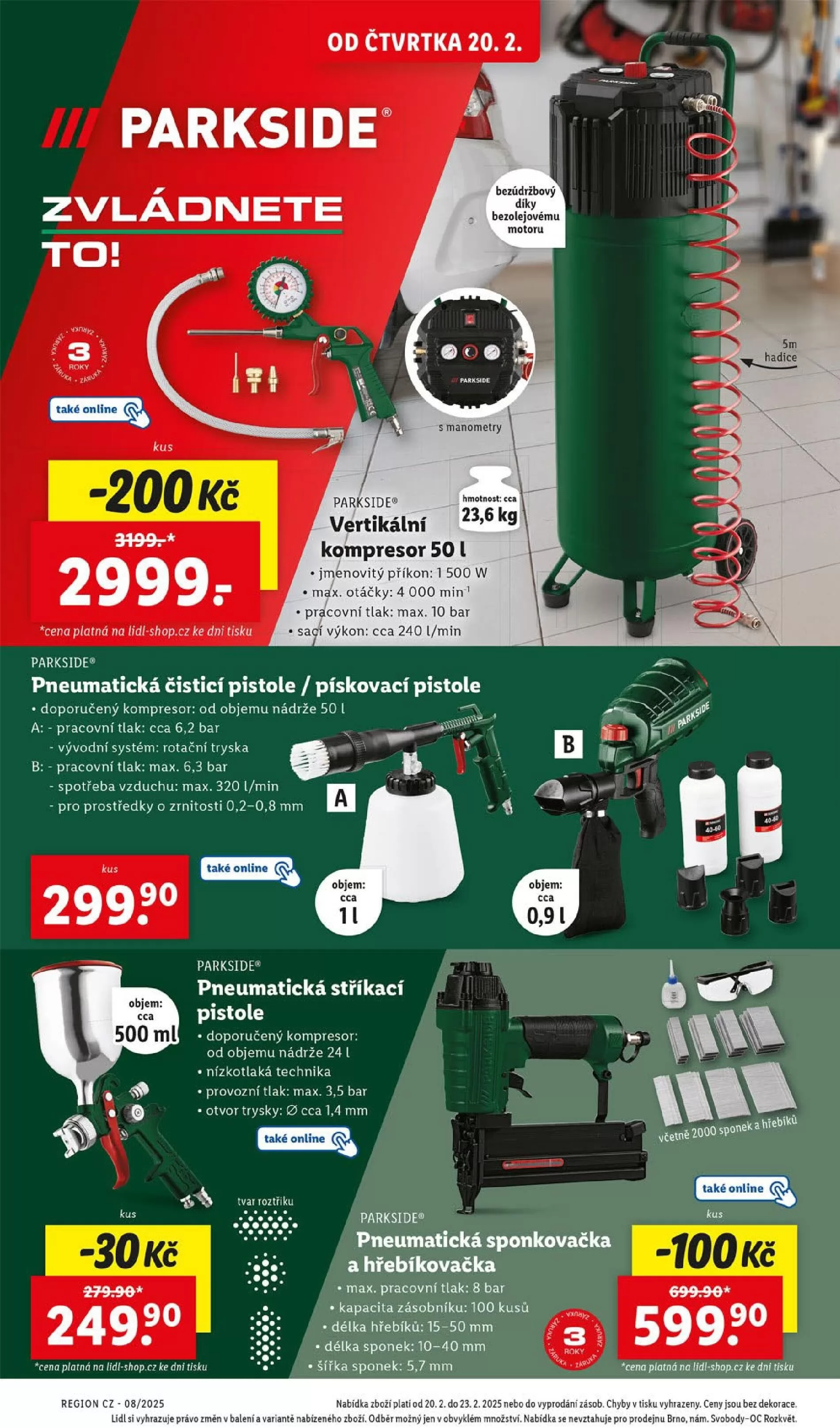 Od čtvrtka 20.2. v obchodě Lidl najdete širokou nabídku produktů značky Parkside. Mezi hlavními položkami je vertikální kompresor s bezolejovým motorem, který má příkon 1 500 W a maximální pracovní tlak 10 bar. Je ideální pro použití s pneumatickými čisticími a pískovacími pistolemi.