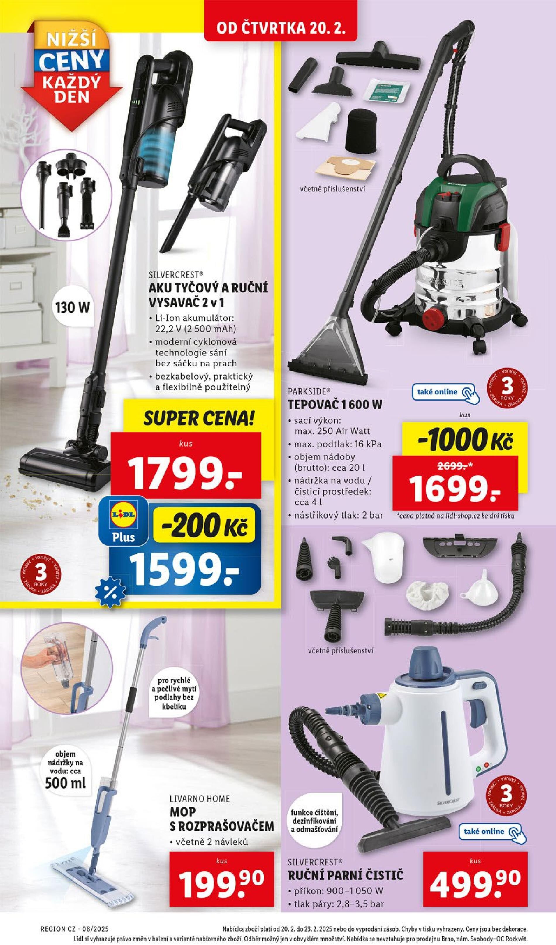 V letáku obchodu Lidl najdete skvělé produkty, které vám usnadní domácí práce. Od čtvrtka 20. února 2025 si můžete pořídit akumulátorový a ruční vysavač Silvercrest za super cenu 1799 Kč. Tento bezkabelový vysavač s moderní cyklonovou technologií nabízí výkon 130 W a objem nádržky na vodu cca 500 ml.