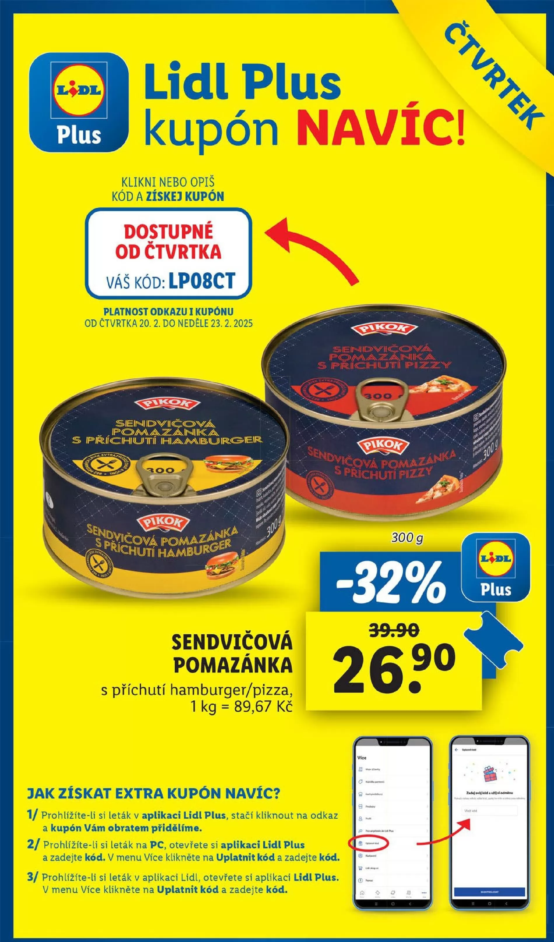 V letáku obchodu Lidl najdete skvělé nabídky a akce! Od čtvrtka 20.2. do neděle 23.2.2025 můžete využít speciální kupón s kódem lp08ct. Tento kupón vám přinese výhodné slevy na vybrané produkty. Například si můžete zakoupit sendvičovou pomazánku s příchutí hamburger nebo pizza, která je k dostání za cenu 89,67 Kč za kilogram.