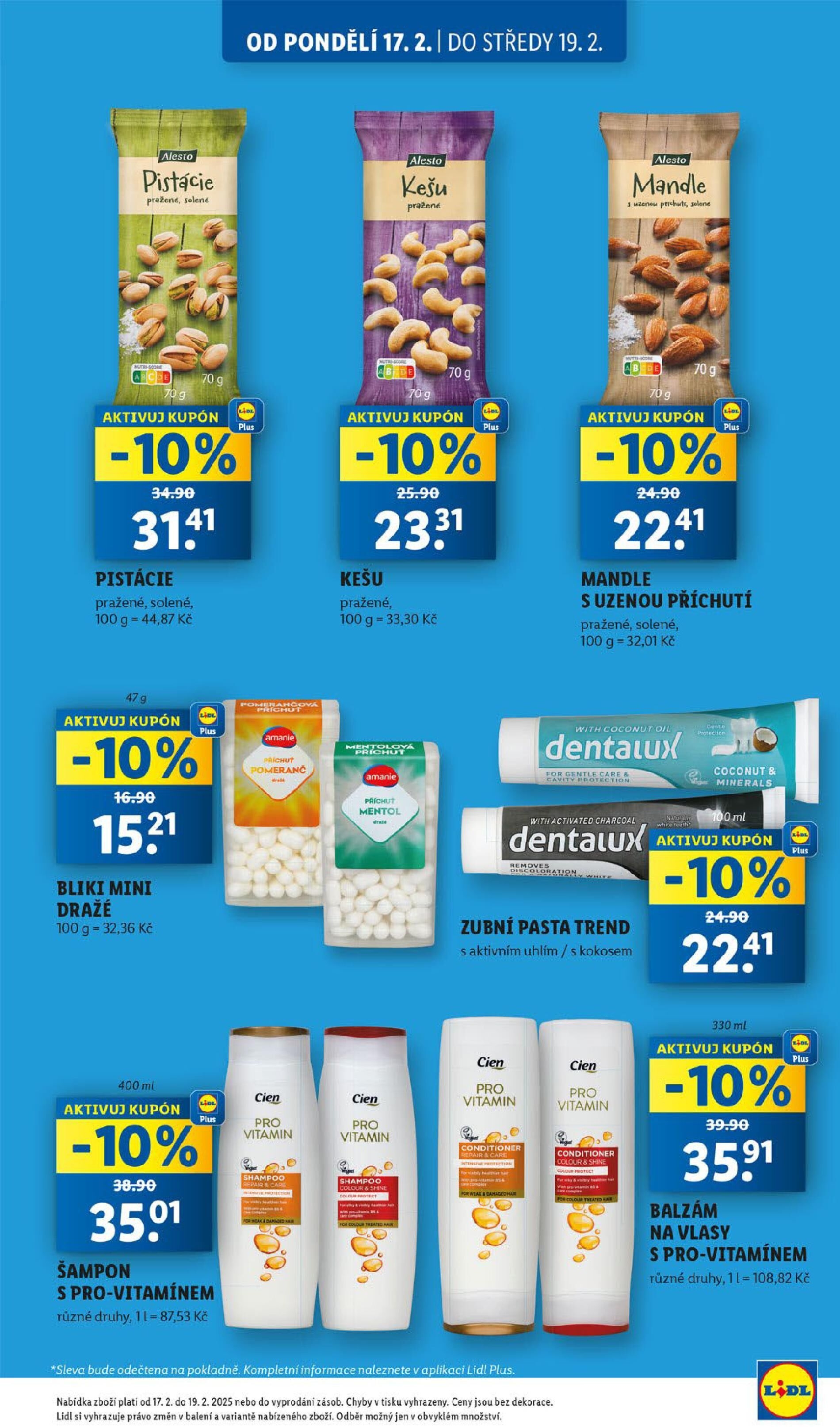 Od pondělí 17.2. do středy 19.2. si v Lidlu můžete vybrat z široké nabídky produktů. Mezi nimi najdete pražené a solené pistácie Alesto za 44,87 Kč za 100 g. Dále jsou k dispozici mini dražé Bliki za 32,36 Kč za 100 g a šampon s pro-vitamínem v různých druzích za 87,53 Kč.