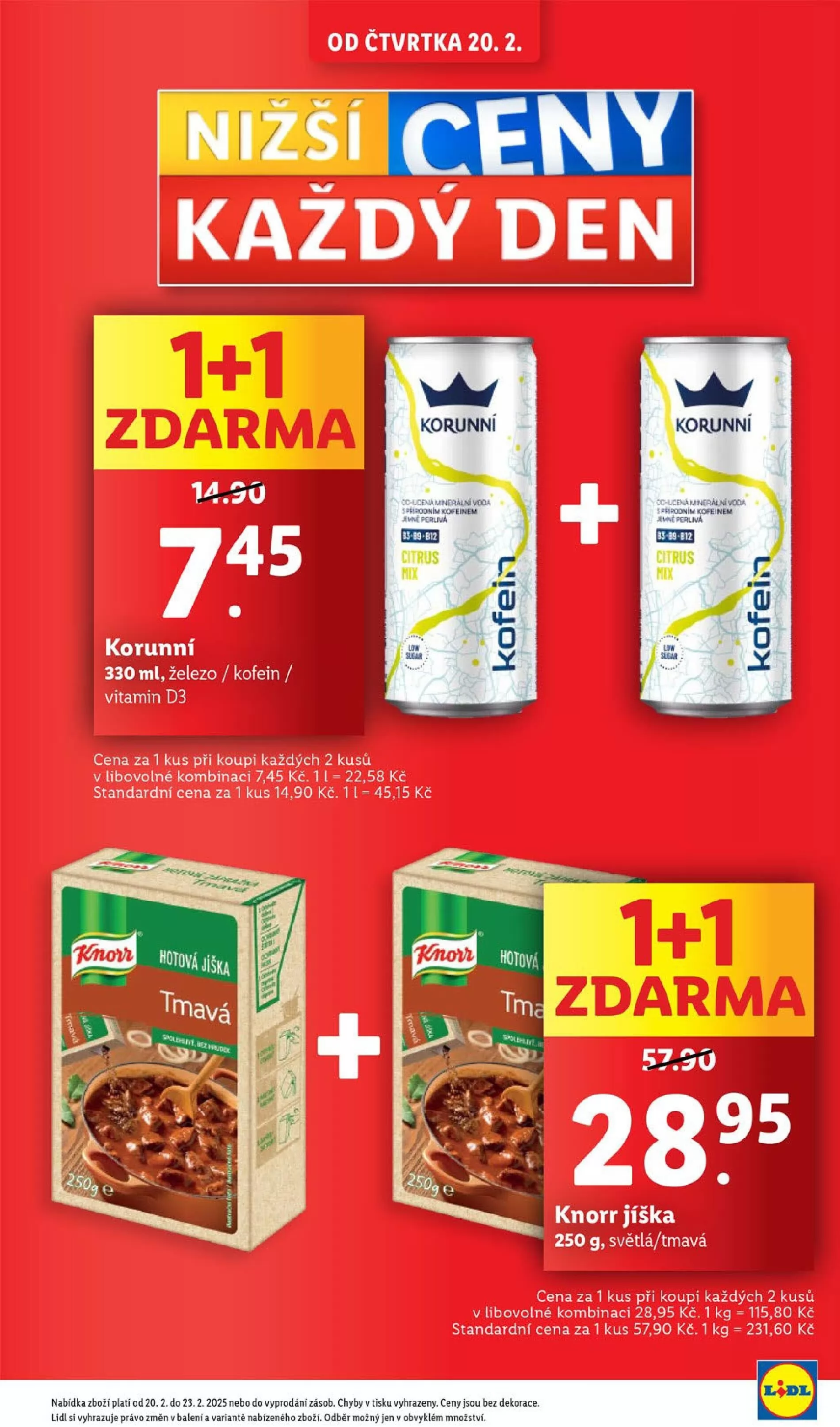 Od čtvrtka 20.2. si v Lidlu můžete vychutnat skvělé nabídky! Každý den máte možnost získat zdarma korunní nápoj o objemu 330 ml, který obsahuje železo, kofein a vitamin D3. Při koupi každých dvou kusů v libovolné kombinaci je cena za jeden kus 7,45 Kč, standardní cena je 14,90 Kč.