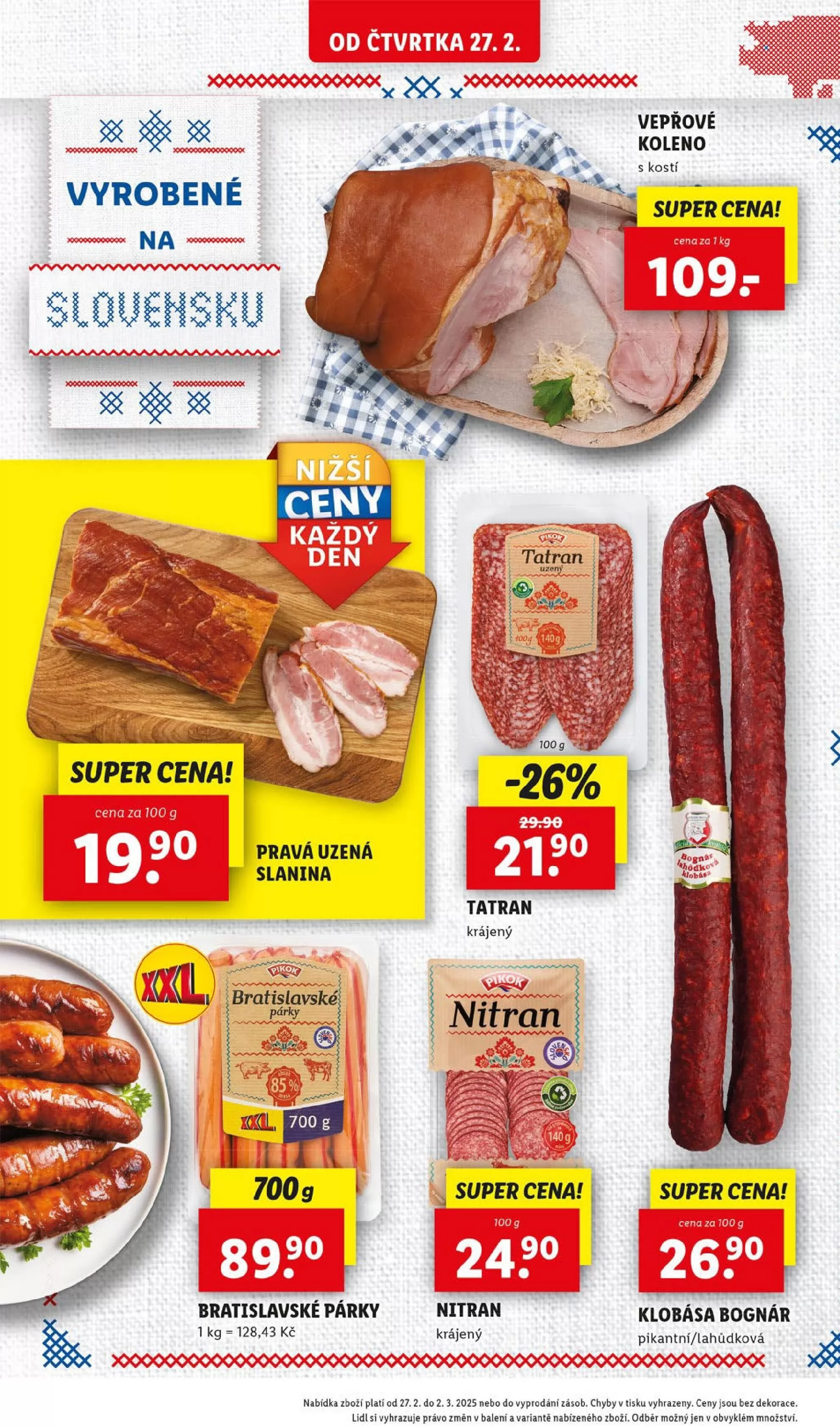 Od čtvrtka 27.2. přichází Lidl s výhodnou nabídkou! V letáku najdete pravou uzenou slaninu za skvělou cenu 19,90 Kč za 100 g. Dále nabízíme bratislavské párky, které si můžete pořídit za 128,43 Kč za 1 kg. Nezapomeňte také na krájené vepřové koleno s kostí, které je nyní za super cenu 109 Kč. A pro milovníky klobás máme pikantní a lahůdkovou klobásu Bognár. Tato nabídka platí od 27.2. do 2.3.2025 nebo do vyprodání zásob. Ceny jsou bez dekorace a Lidl si vyhrazuje právo na změny v balení a variantách nabízeného zboží.
