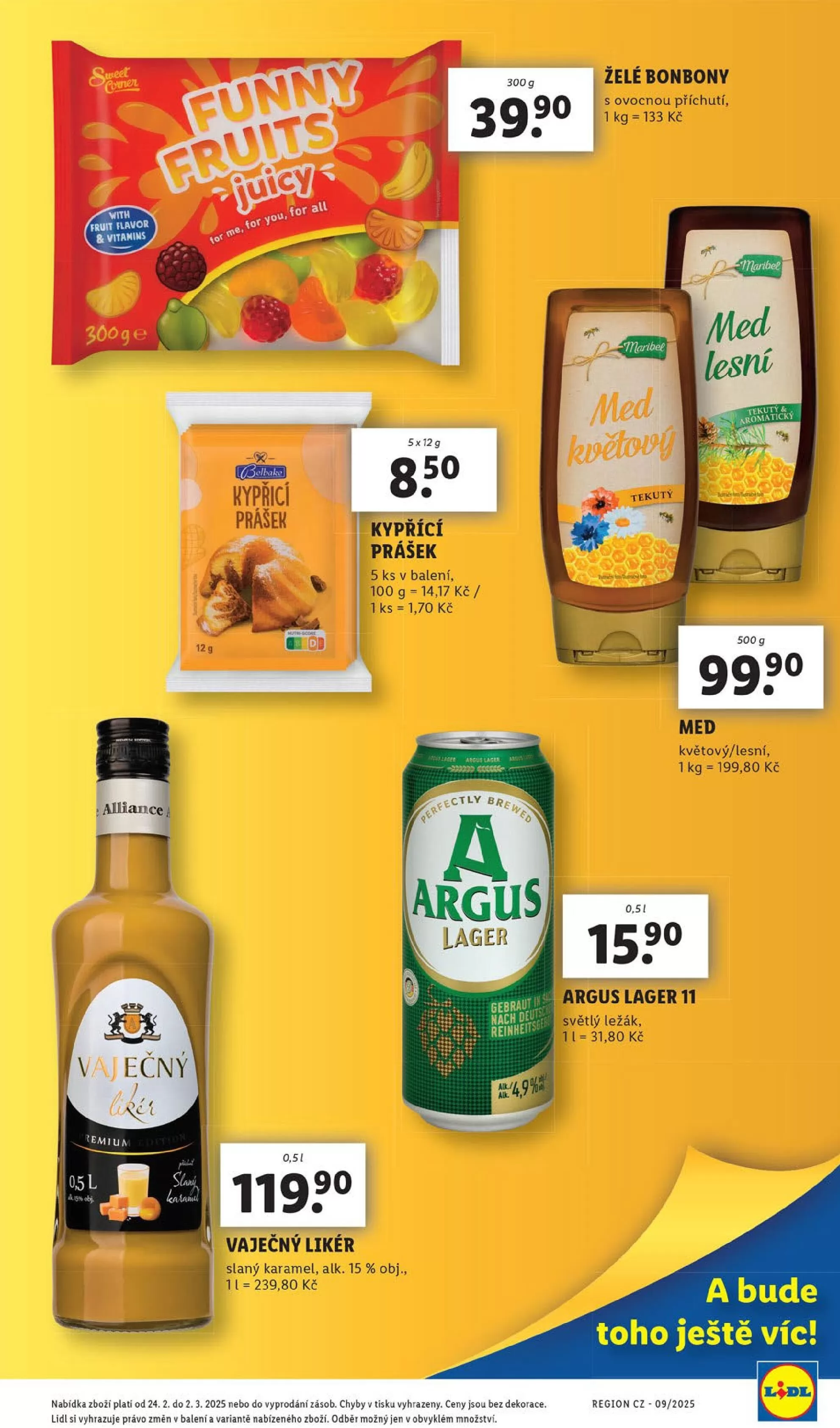 V letáku obchodu Lidl najdete širokou nabídku produktů, které potěší vaše chuťové pohárky. Mezi nimi jsou například želé bonbony Argus s ovocnou příchutí, které si můžete pořídit za 133 Kč za kilogram. Dále nabízíme kypřící prášek v balení po 5 kusech, jehož cena je 1,70 Kč za kus.