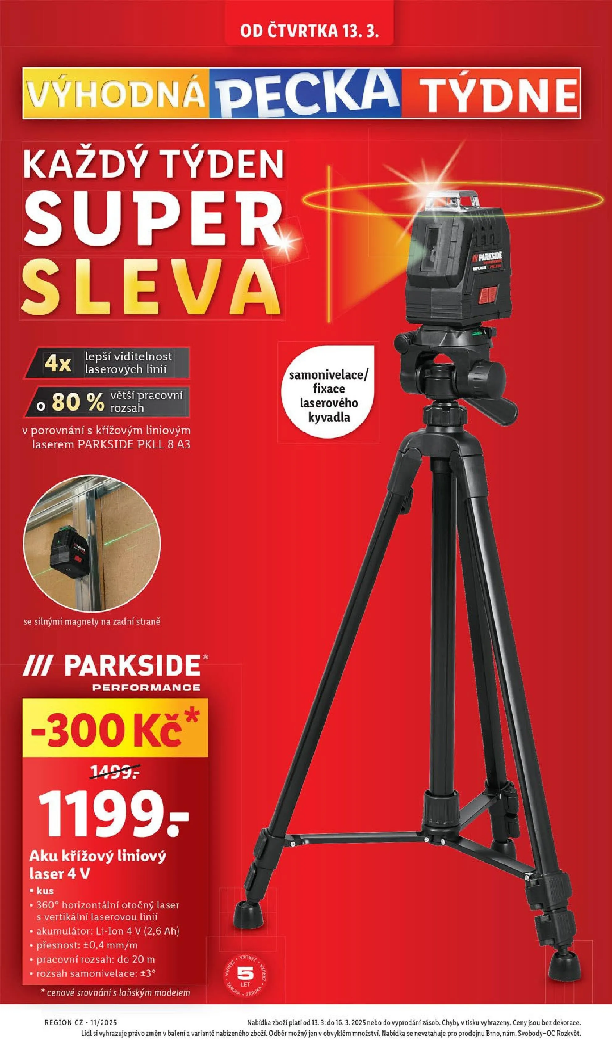 Od čtvrtka 13.3. v Lidlu najdete skvělou nabídku na aku křížový liniový laser 4 v 1. Tento laser nabízí 360° horizontální otočný laser s vertikální laserovou linií a je vybaven silnými magnety na zadní straně pro lepší viditelnost. S akumulátorem li-ion 4 V (2,6 Ah) a přesností +0,4 mm/m je ideální pro různé projekty. Pracovní rozsah dosahuje až 20 m a laserové kyvadlo se samonivelací zajišťuje snadné použití. Akční cena je 1199 Kč, platnost nabídky je od 13.3. do 16.3.2025 nebo do vyprodání zásob. Nezapomeňte, že nabídka se nevztahuje na prodejnu Brno, nám. Svobody.