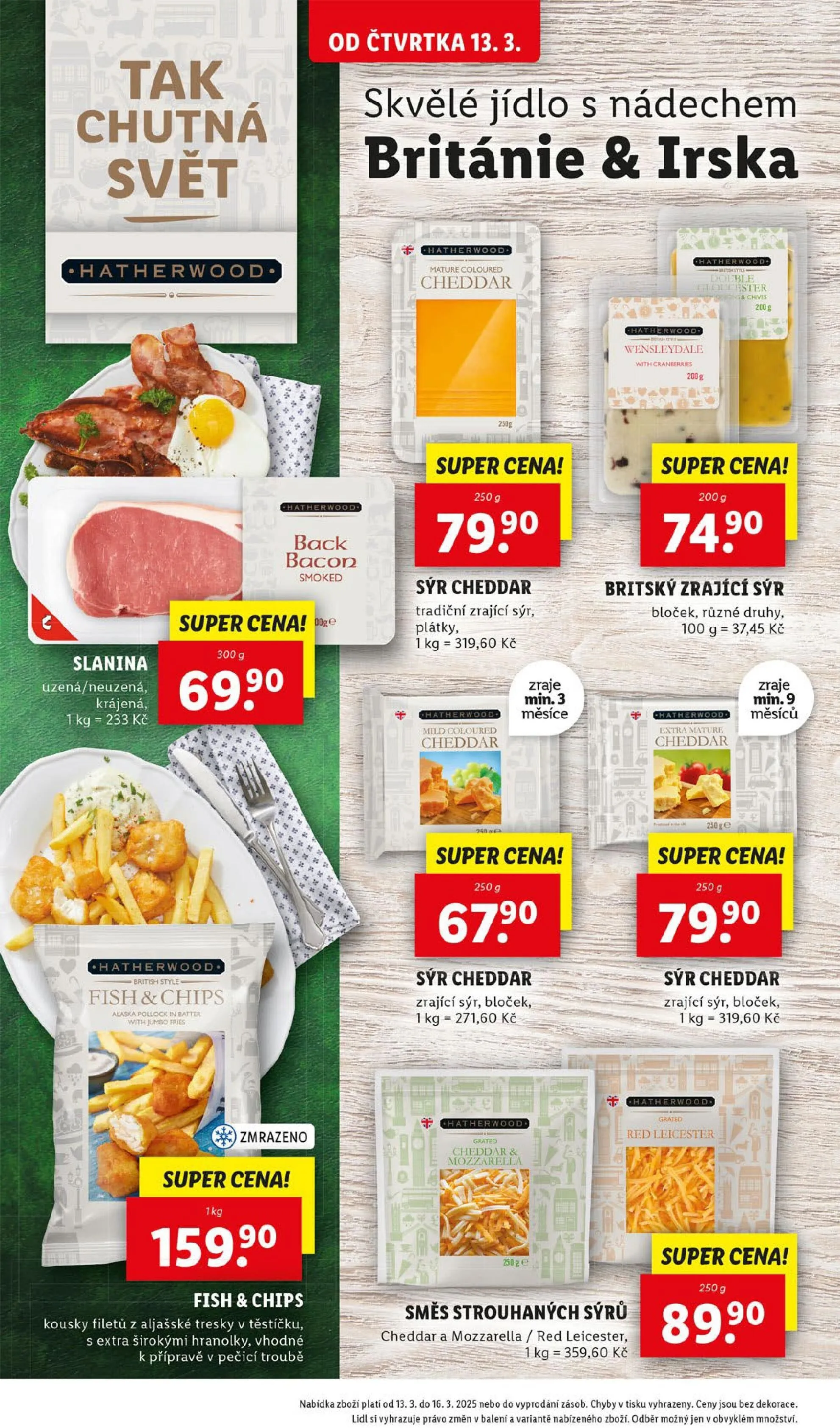 V letáku obchodu Lidl najdete skvělé nabídky na produkty z Británie a Irska. Od čtvrtka 13.3. si můžete pořídit slaninu (uzenou/neúzenou, krájenou) za super cenu 69 Kč za 1 kg. Dále je v nabídce tradiční zrající sýr Cheddar v plátcích za 319,60 Kč za 1 kg. Nezapomeňte také na britský zrající sýr v bločku, který je k dostání za 37,45 Kč za 100 g.
